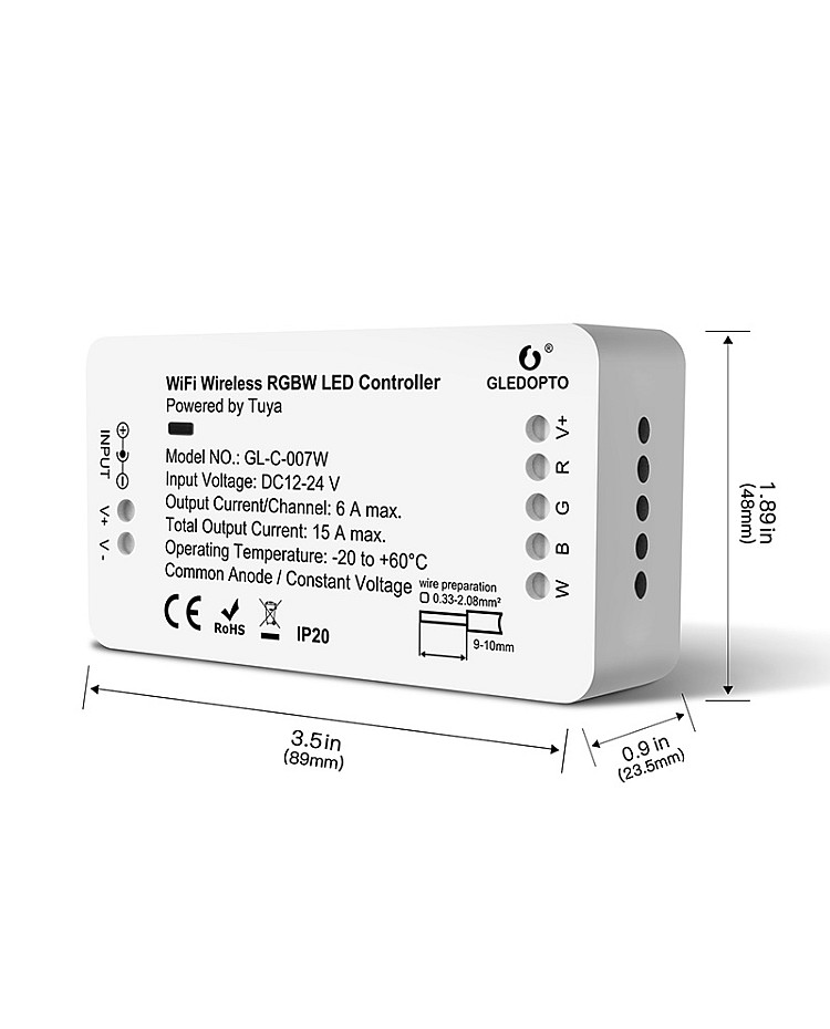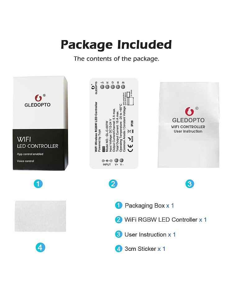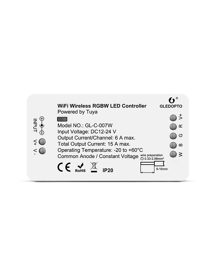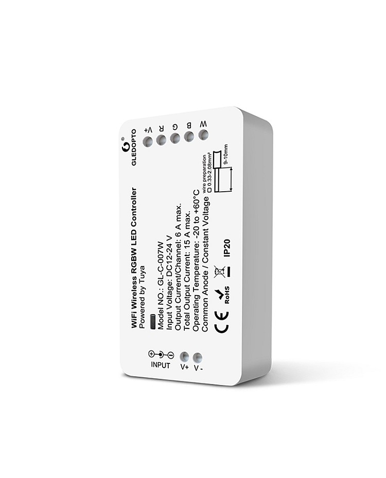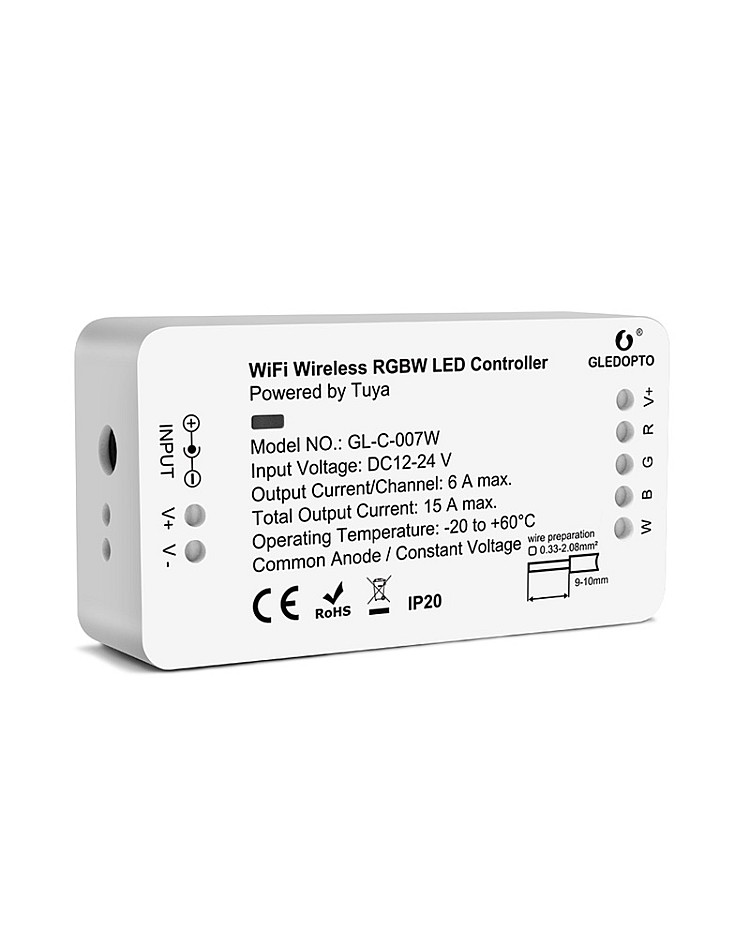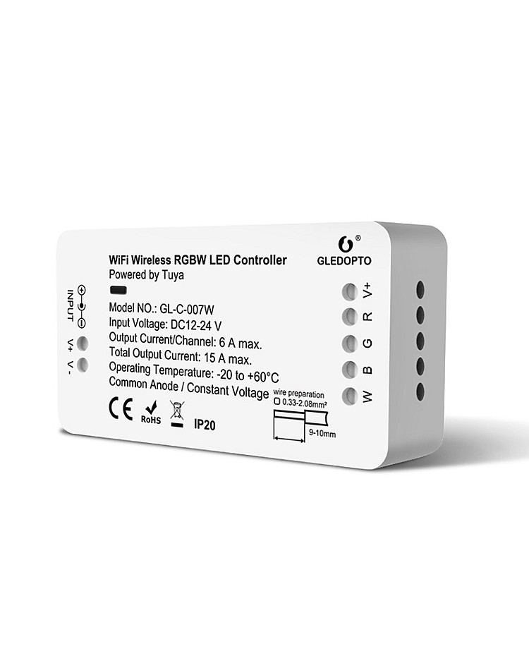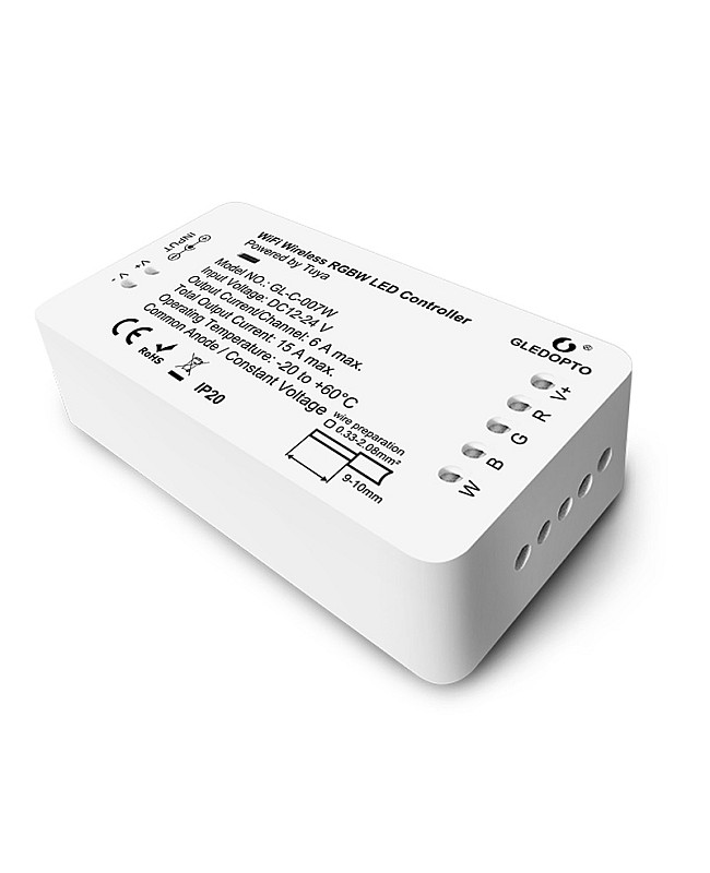 The Gledopto RGBW WiFi controller can be added to your home WiFi network and controlled by the Tuya APP and voice control. No gateway is required, and it is easy to connect and use. You can set the static color, adjust the color temperature, and brightness. There are 16 million colors available, and the color temperature can be adjusted from 2000K to 6500 K. You can mix RGB and white light to adjust the color temperature. Brightness is adjustable from 1% to 100%, so choose the correct brightness according to your needs. The Gledopto RGBW controller works with Amazon Echo Plus, where you can adjust brightness ON/OFF through voice commands, which can free your hands. The WiFi RGBW controller works on DC12V or DC24V, with 4 output channels and a max output current of 15A, with a press-type wiring terminal design, and is easy to connect to a power supply and RGBW LED strips for indoor lighting applications.
