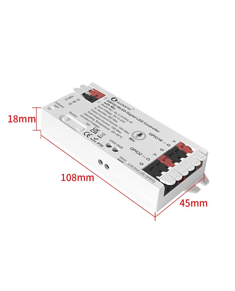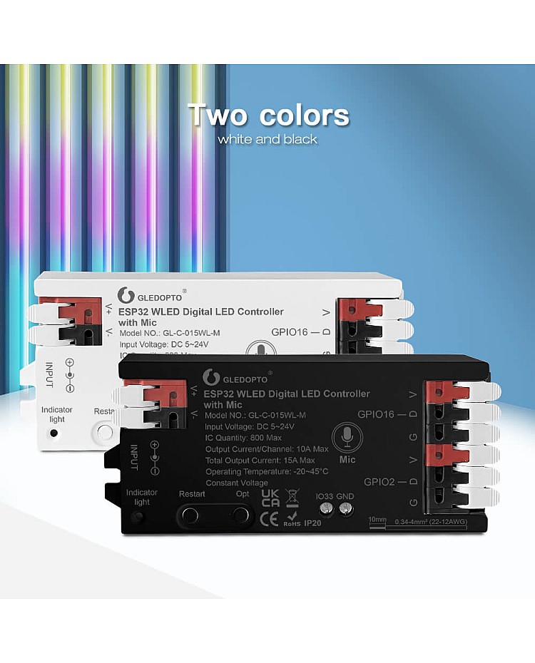The Gledopto ESP32 controllers are designed for addressable LED strip lights and digital backlighting panels. Offering powerful performance, flexible configuration, and smart lighting integration. They are built with an ESP32 chipset and are compatible with WLED Native firmware. Easy to choose from up to 250 preset lighting effects for your applications, and supports WiFi app control, remote control, and firmware upgrade.