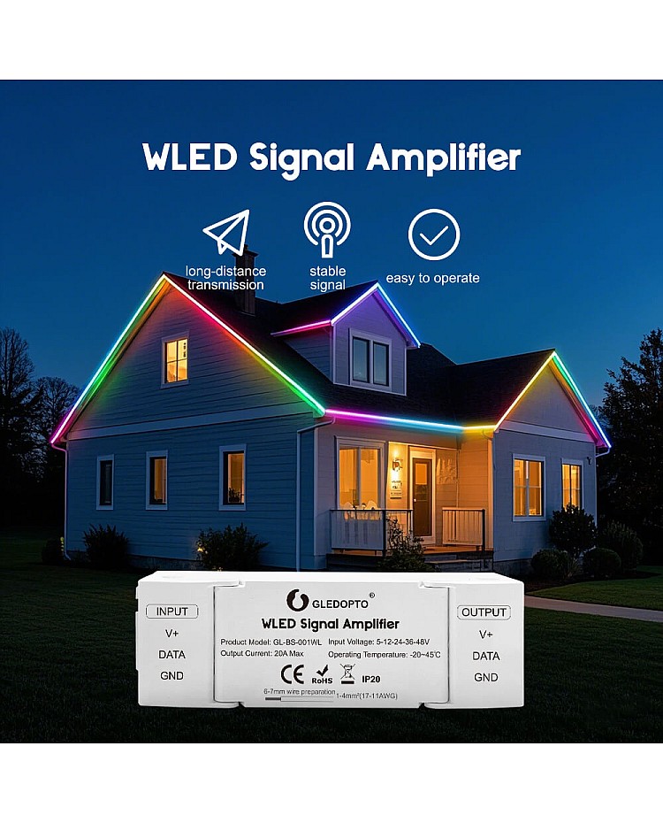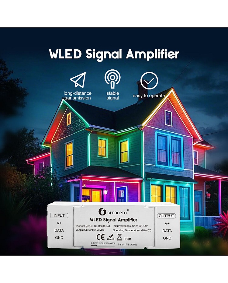 The WLED signal amplifiers are designed for Gledopto WLED controllers and fixtures. You can use them to boost the signals and extend the signal transmission distance between WLED controllers and programmable strip lights, allowing wire lengths up to 10 meters. The WLED amplifiers will correct signal issues caused by excessively long light strip wiring, such as automatic flickering and color changes. By connecting the WLED booster between the WLED controllers and addressable LED strips, these abnormal phenomena can be effectively eliminated. Its core function is to correct signal distortion caused by long-distance transmission, ensuring that the signal received by the light strips remains stable and accurate, thereby restoring typical lighting effects.