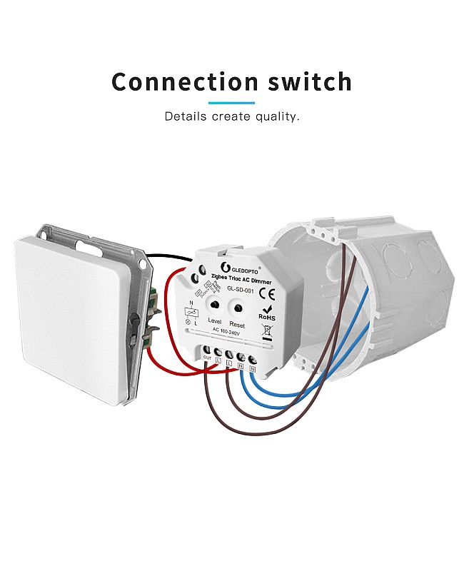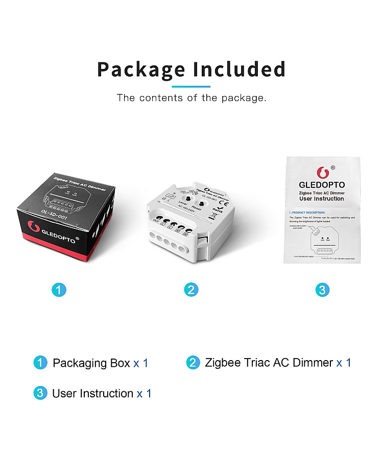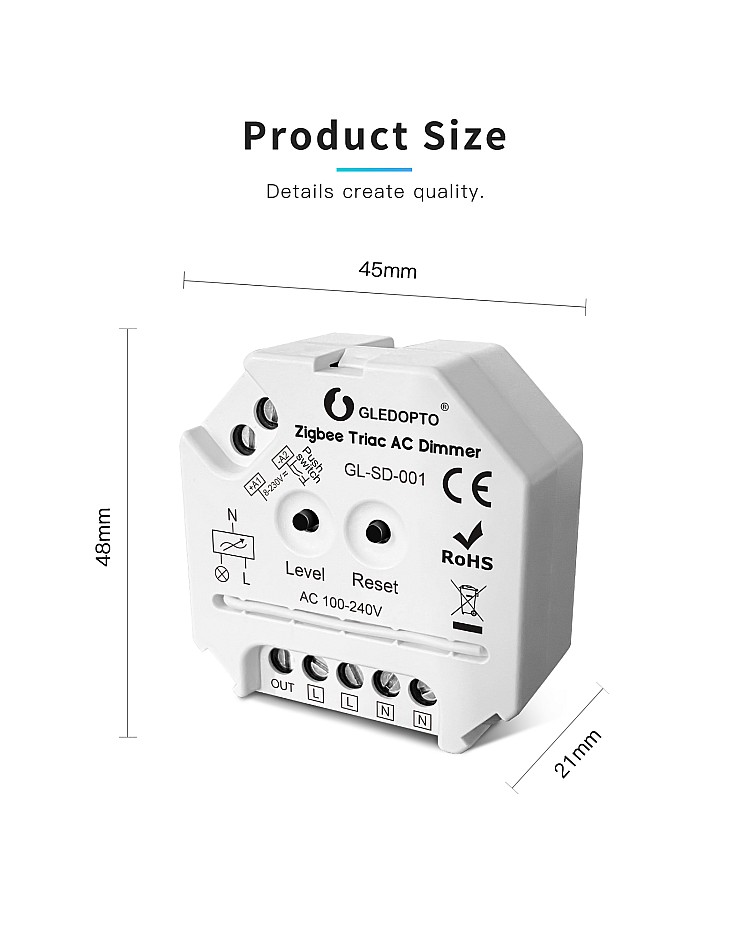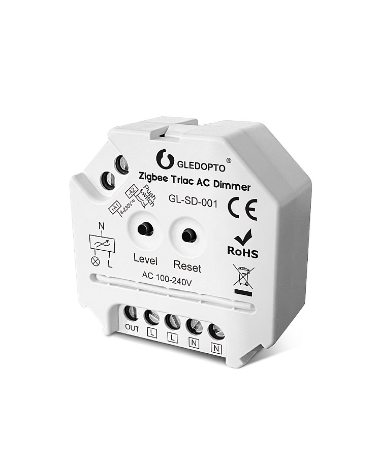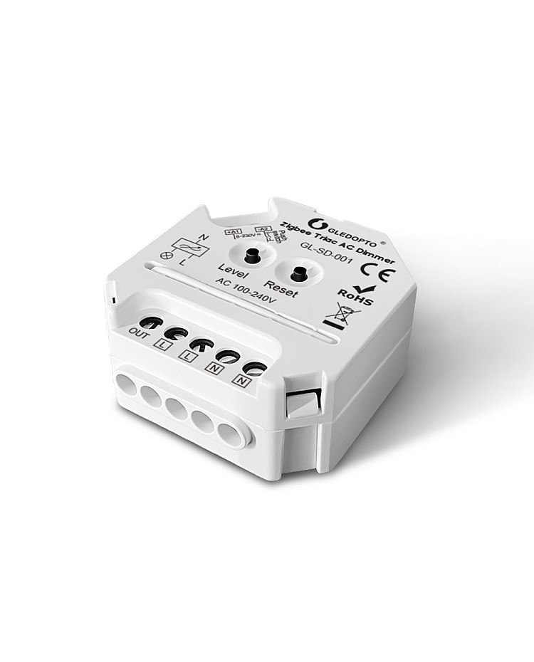 The Gledopto Zigbee 3.0 smart AC triac LED dimmers are compatible with Zigbee 3.0 gateways. You can use them for the dimmable LEDs, halogens, incandescents, and LEDs to adjust the brightness and to switch lights on and off. It has a trailing edge dimming design, anti-interference, and soft power ON or OFF, which is suitable for long-term use of lights. The triac AC dimmers can be controlled by a smartphone APP, and you can control the lights through the phone APP. The smart LED dimmer can also be controlled by a push switch and a 2.4 GHz RF remote control without a Zigbee gateway. There are two buttons on the surface of the triac dimmer. Press the button "Level" to turn on/off the device or adjust the brightness. Press the button " Reset " to set the MIN Brightness or reset the device. The Gledopto smart dimmer has one output channel design and a max loading power of up to 400W, so it is not waterproof for indoor lighting applications.