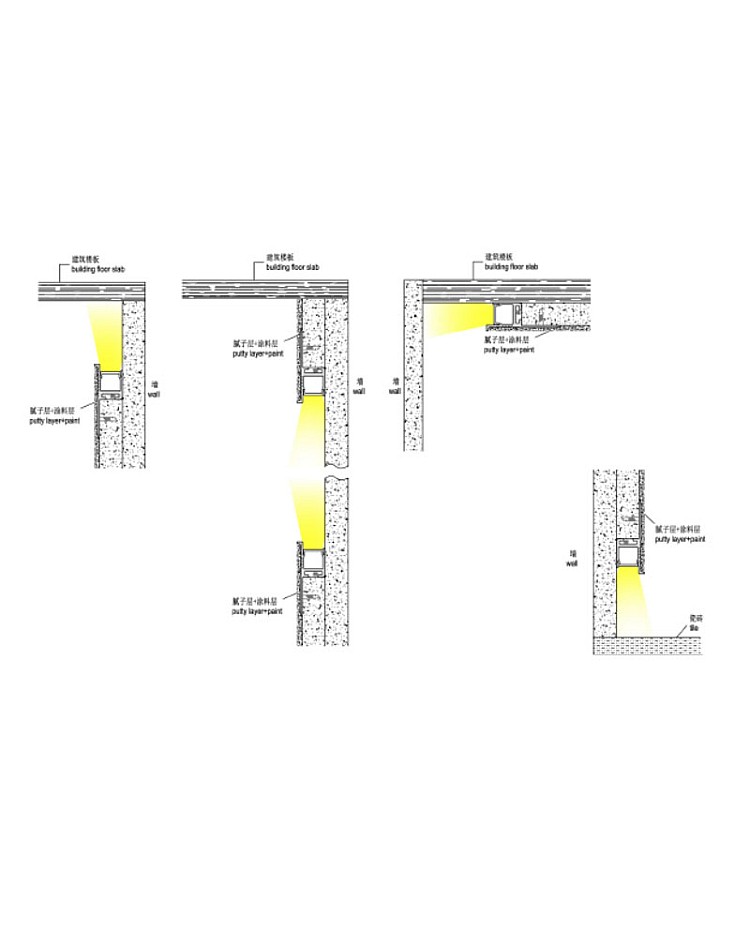 The recessed lighting channels can be mounted seamlessly into the 1/2” gypsum boards and can be used for creating pretty accent lighting in drywall and ceilings. Ideal for modern lighting designs, this plasterboard LED channel enables decorative backlit effects for walls, ceilings, and floors. The slim LED channels are made of 6063-T5 extruded aluminum material and feature anodized surface treatment, providing anti-oxidation resistance and a longer lifespan compared to similar products. The standard lengths are 1 m and 2 m; cuttable and custom lengths are also available. The inner width is 10.3mm, allowing for a maximum width of 10 mm for the LED strips. We recommend installing the flexible COB LED strip lights as the light source, without visible light dots and dark areas. Only one type of diffuser is available: the PC diffused cover, made of high-quality material that is anti-yellowing and features perfect light distribution and smooth light output. There are three types of connectors available. You can use them for straight or angled connections.