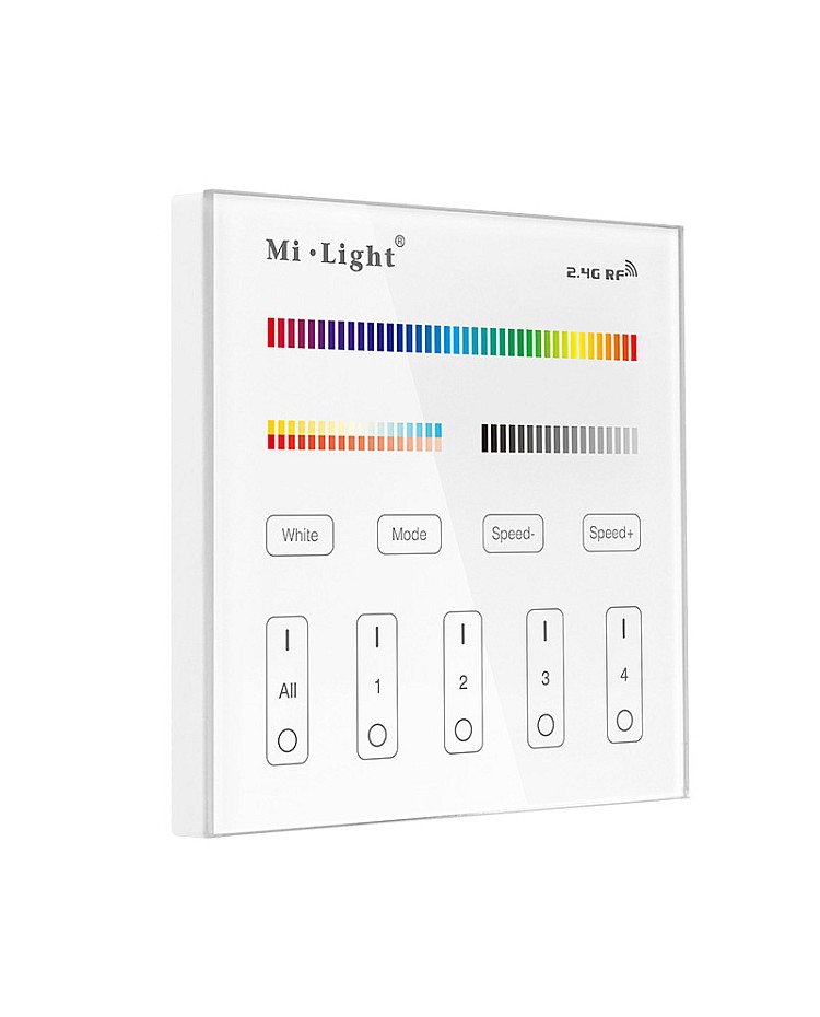 The 4 Zones MiBoxer T4 RGB CCT LED remote works on high voltage AC100V to AC240V, and you can connect it to your home power system directly. The MiBoxer T4 adopts a 2.4G wireless transmitting module with a control distance of up to 30 meters. With a sensitive touch panel design, slightly touch the panel to choose from 16 million colors. You can touch the color temperature slider to adjust the CCT from 2700K to 6500K and change the color saturation under color mode. You can touch the brightness slider to adjust the brightness from 1% to 100%. There are 9 dynamic modes to fulfill your different scenes. When touching the button, the indicator light will flash with a sound. You can use the MiBoxer LED remote to work with Milight and MiBoxer RGB, RGBW, and RGB+CCT products.