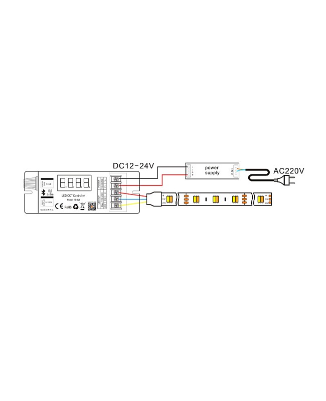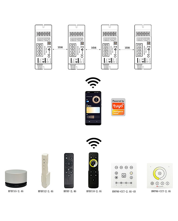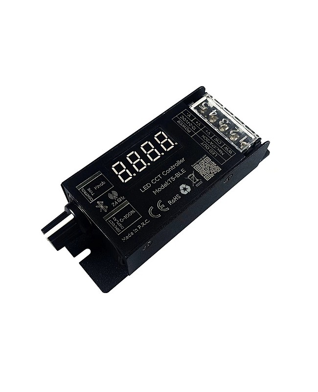 The Hoion T5-BLE high-power Bluetooth dual white light dimmers are designed for precise brightness and color temperature adjustment of tunable white lighting systems. They feature advanced Bluetooth wireless technology, enabling the adjustment of brightness and color temperature for various scenes via the Tuya app, remote control, and the knob button on the controller. The brightness range can be adjusted from 1% to 100% flicker-free, and the color temperature can be set from 100% warm white to 100% cool white. The dimmer has a digital tube showing the brightness level or color temperature. The LEDs can be dimmed or toned according to the application's needs to create a more harmonious environment. The PWM frequency is adjustable from 500Hz to 15.6KHz through the remote control or the knob button, and this button can also be used to adjust the brightness and color temperature. With the Bluetooth MESH APP control, the Hoion CCT dimmer can be controlled by the Tuya APP to achieve intelligent control, including group control, scene customization, timer scheduling, and more, making it a versatile solution for innovative lighting applications. Perfect for modern smart homes, offices, retail stores, and architectural lighting projects.