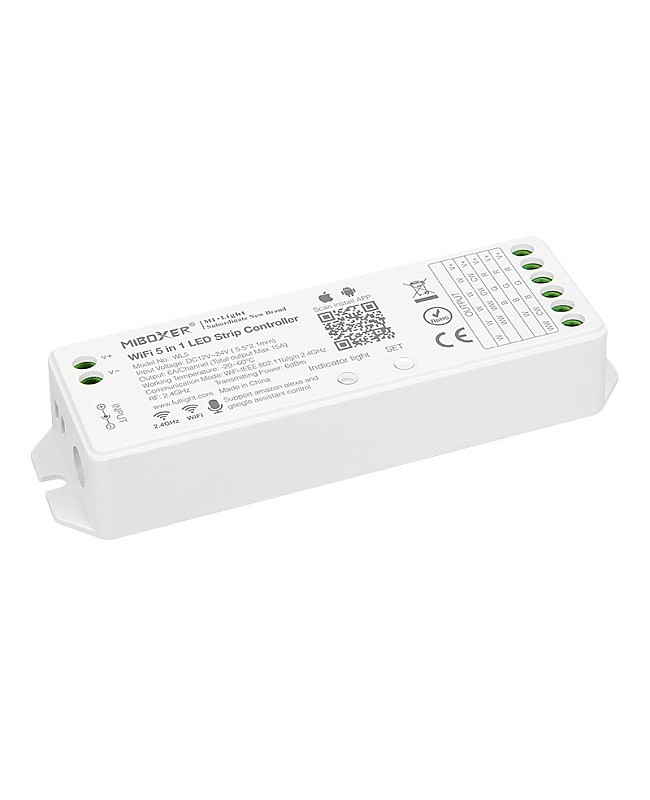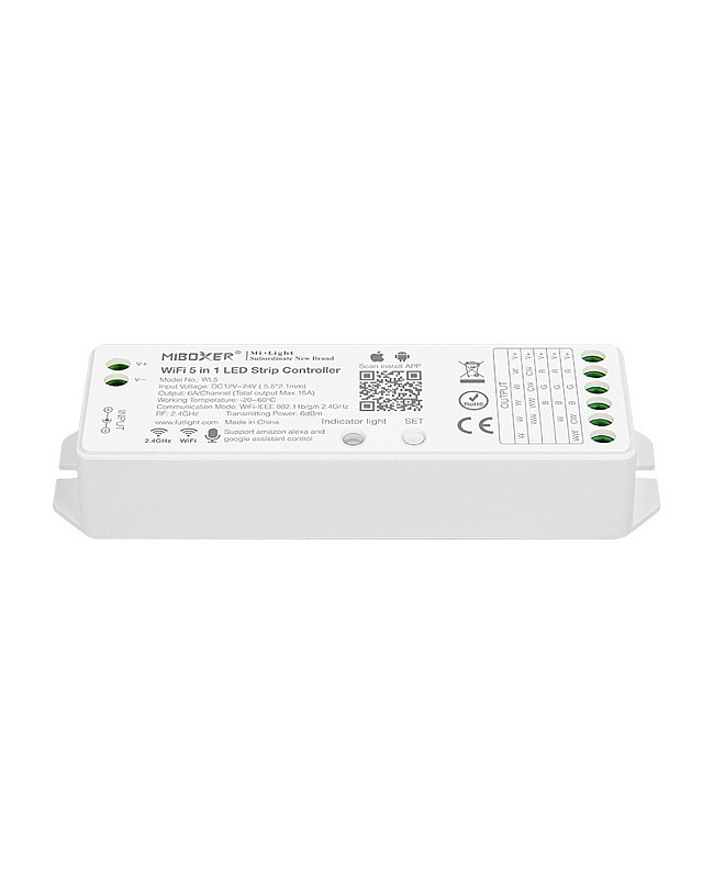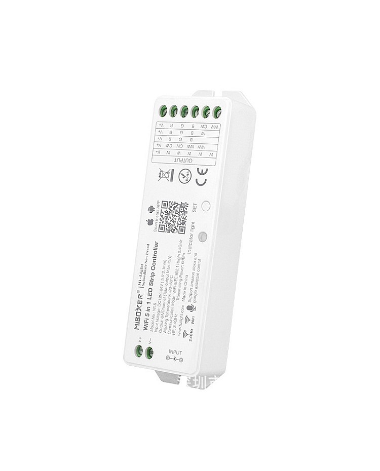 The MiBoxer WL 5 In 1 WiFi LED controller is an ideal choice for those looking for a versatile and reliable controller for LED strip lights. It is designed for single color/CCT/RGB/RGBW/RGB+CCT LED strip lights with its six-channel five-circuit connector for LED strips, WiFi-IEEE 802.11 b/g/n 2.4g protocol, and 4G control, you can easily control your LED strips from anywhere and anytime. You can download the APP and control the LED lights through your smartphone directly, real-time data display, easily realize the personalized settings, and switch the various user interfaces for different LED strips, brightness, color temperature, RGB, RGBW, and RGB+CCT output mode, turn ON the light on your way home and turn OFF the lights when you forget. The MiBoxer LED controller supports third-party voice control and is compatible with Amazon Alexa and Google Assistant, allowing you to control the LED lights with voice commands. The WiFi controllers support remote control, and you can control multiple controllers from one remote within a 30-meter range. You can connect countless WL controllers to set groups through a smartphone APP or a remote control. The controller can also create a synchronous effect by controlling multiple controllers with the same remote, dynamic mode, and speed.