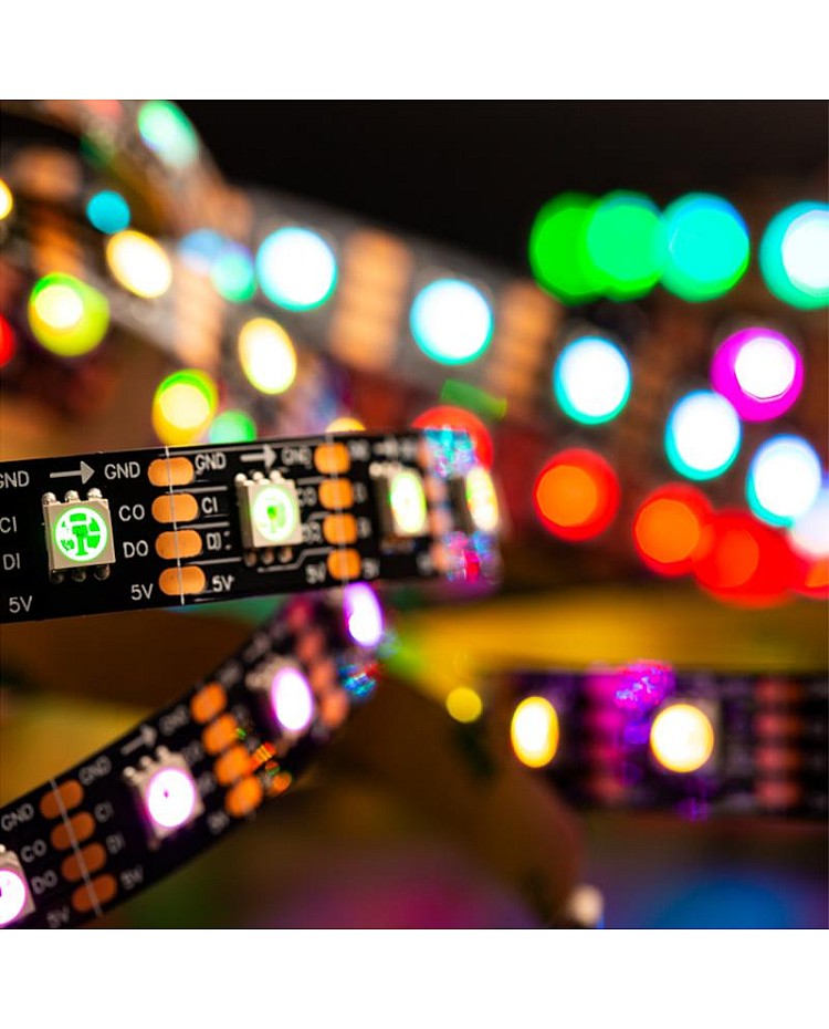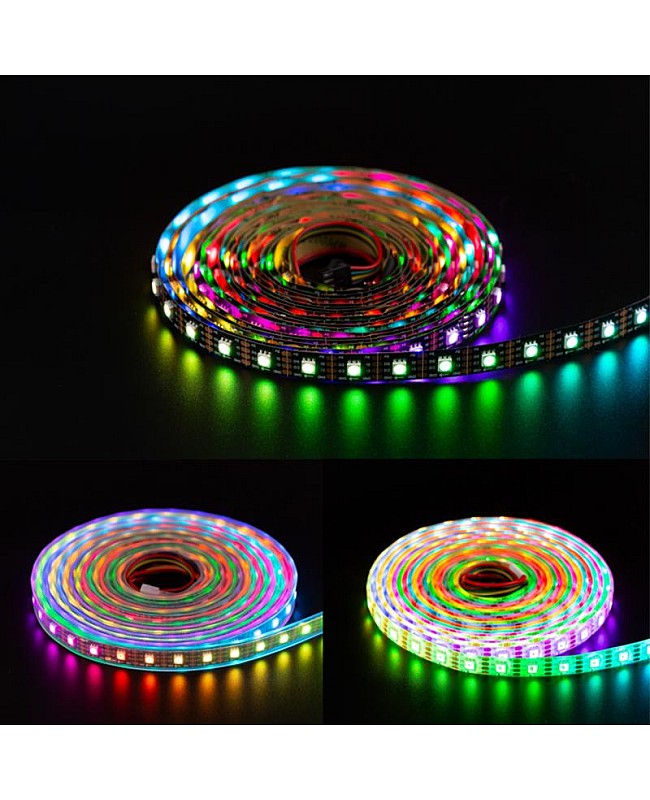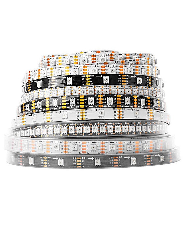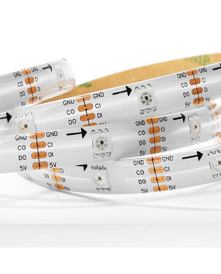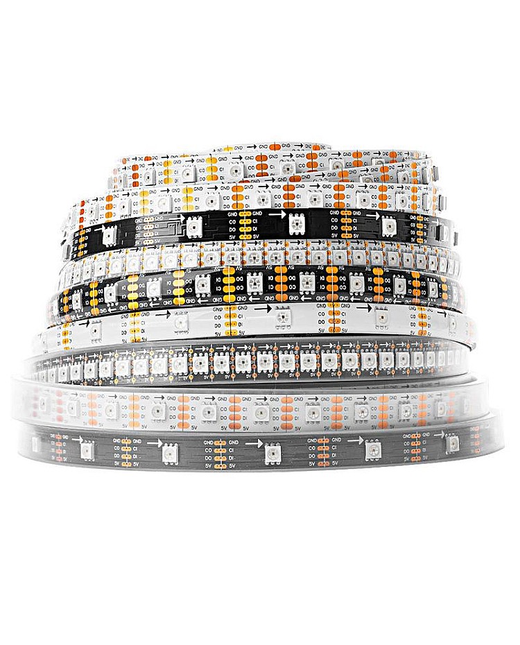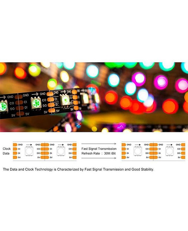 The SK9822 5V LED Strips, which with individually addressable designs, use the high-quality 5050 RGB SMD LEDs as the light source, the LED built-in SK9822 IC, with two signal wires design, the DATA and CLOCK, more stable than a single signal wire and faster, intensity and reliability, can work with our Addressable LED Light Controllers to achieve the thousands of amazing lighting effects, easy to appear the significant effect like curtain-up, flow water, raindrop, jump, flash, etc. You can edit the animation effect with CorelDRAW, Flash, or LED Edit software for DIY effects. There are three types of LED quantities and three types of waterproof levels of products available, allowing you to choose from 30 LEDs per meter, 60 LEDs per meter, or 144 LEDs per meter. IP30, IP65, and IP67 Waterproof SK9822 LED Strips are available, and you can use the IP30 and IP65 Strip for outdoor lighting applications. The back of both of them is covered with double-sided adhesive tape, making it easy to install and use. You can install the IP67 Addressable LED Tapes for outdoor projects in wet, damp, or waterlogged locations. Every LED is cuttable, allowing you to trim it to any desired length for your project easily. The 4-pin JST Connector and 4-pin JST-SM Connector are easy to connect to the DreamColor Addressable LED Strip Controllers.