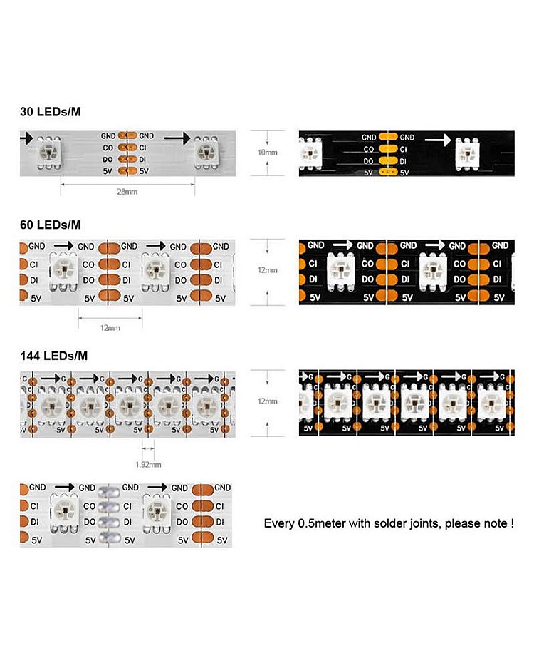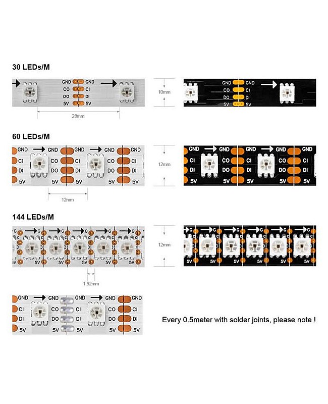 - Width: 10mm(30LEDs/M), 12mm(60LEDs/M, 144LEDs/M)
