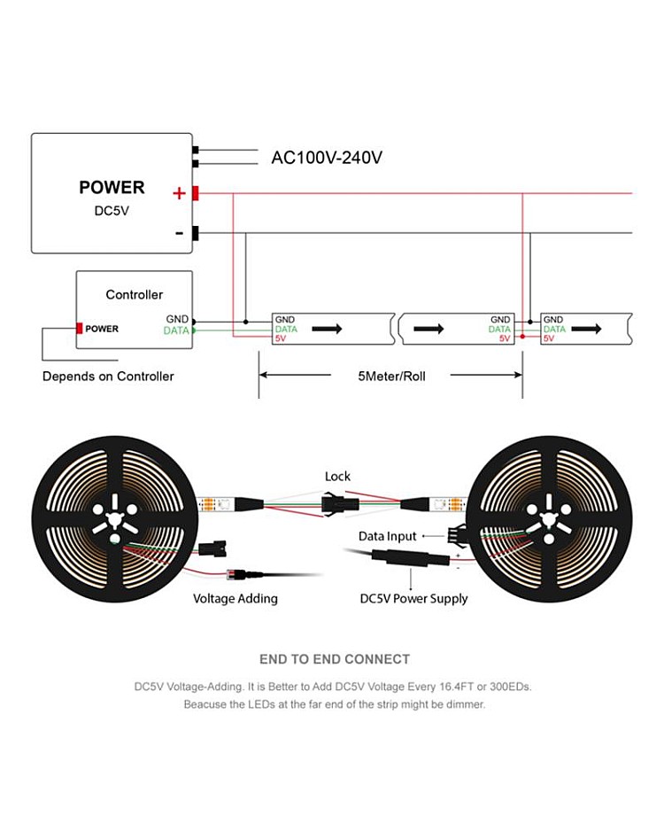 The LEDs at the far end may be dimmer due to the added resistance and voltage drop. We recommend adding the same working voltage every 5 meters (16.4 ft) according to the actual situation to maintain the same brightness.
