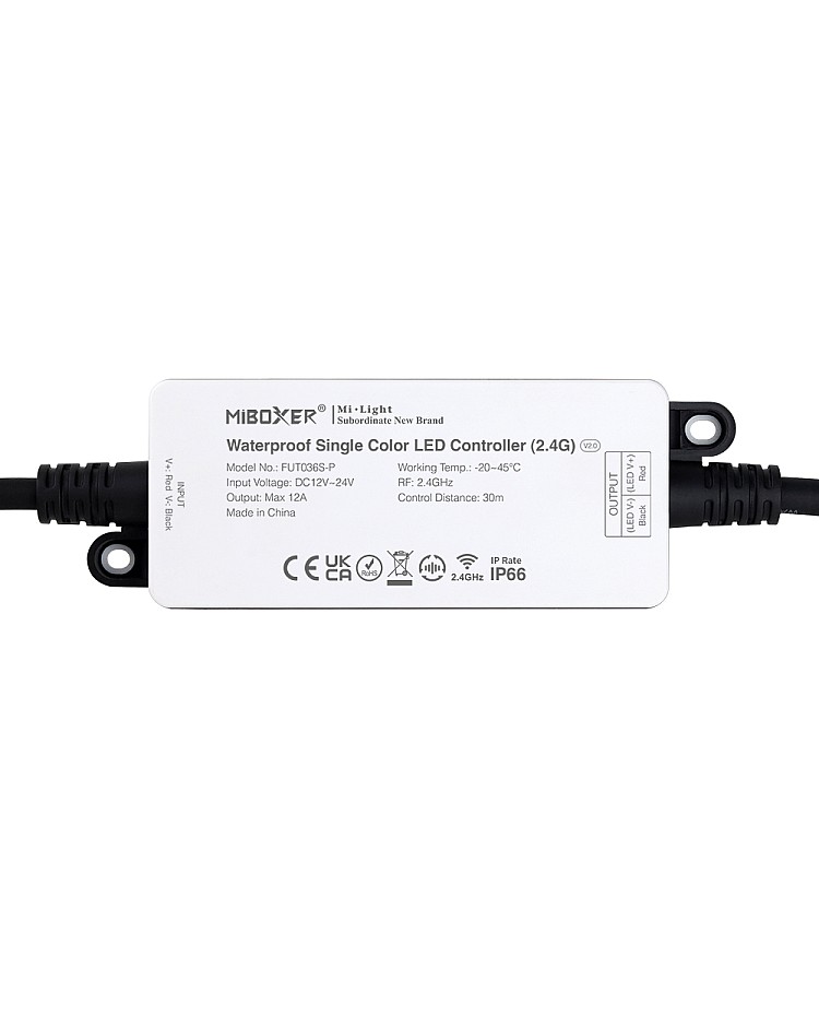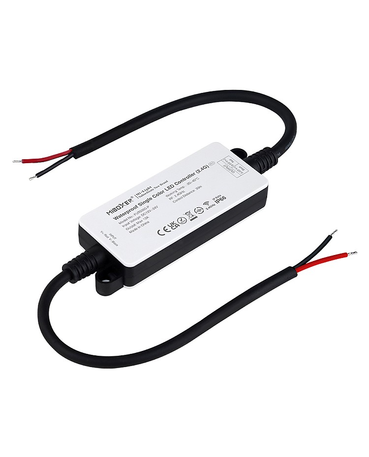 The outdoor waterproof LED single color dimmer, with a waterproof level of up to IP66, can be used for outdoor lighting projects. The working voltage is DC12V-DC24V, with one output channel, and the maximum output current is 12A. The IP66 LED dimmer integrates a 2.4G transmit module, and the control distance is up to 30m. One dimmer can transmit the signals from the remote control to another; if the control distance is within 30m, the remote control distance can be limitless. The outdoor light dimmer is compatible with most 2.4G RF single color light remotes: FUT087, FUT007, FUT006, S1, B1, T1, B2, T2, and K1. After adding a 2.4G gateway WL-BOX1, the MiBoxer waterproof dimmer supports smartphone APP control and third-party voice control, supporting Amazon Alexa and Google Assistant. You can adjust the brightness from 1% to 100% for various scenes. It supports PWM high-frequency 8KHz or low-frequency 500Hz switched.