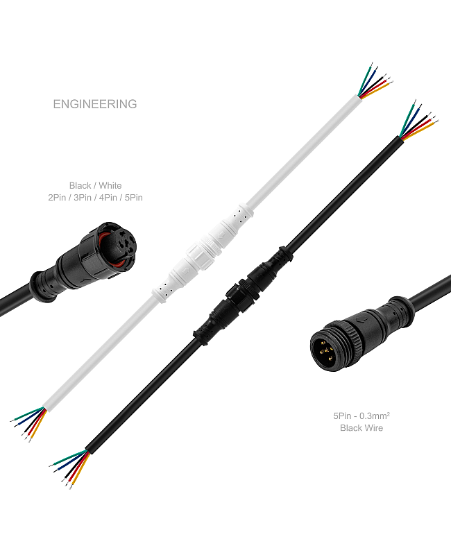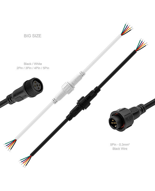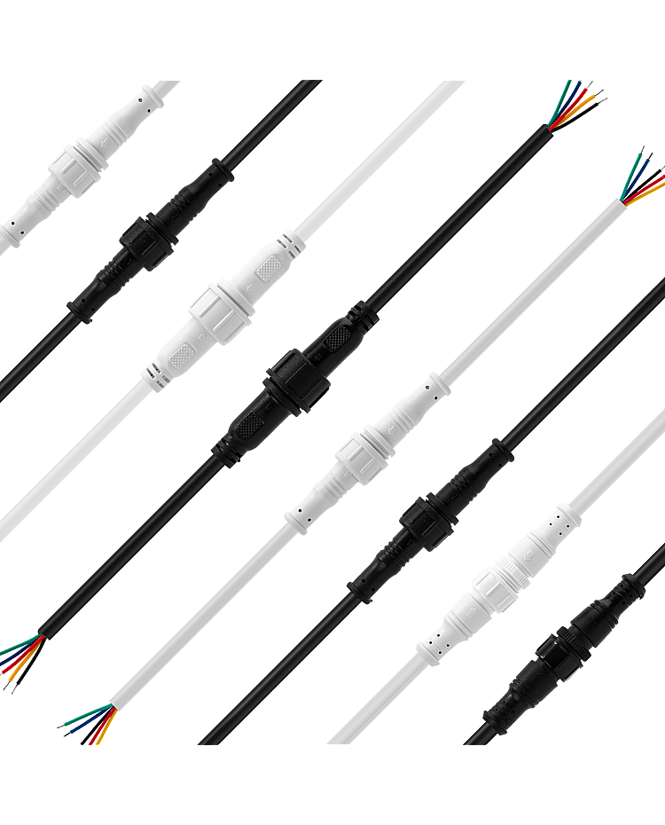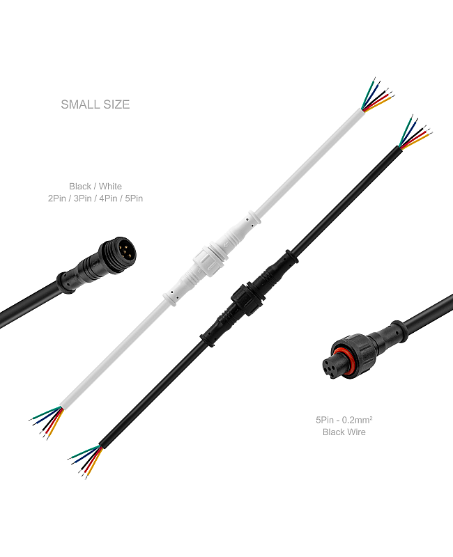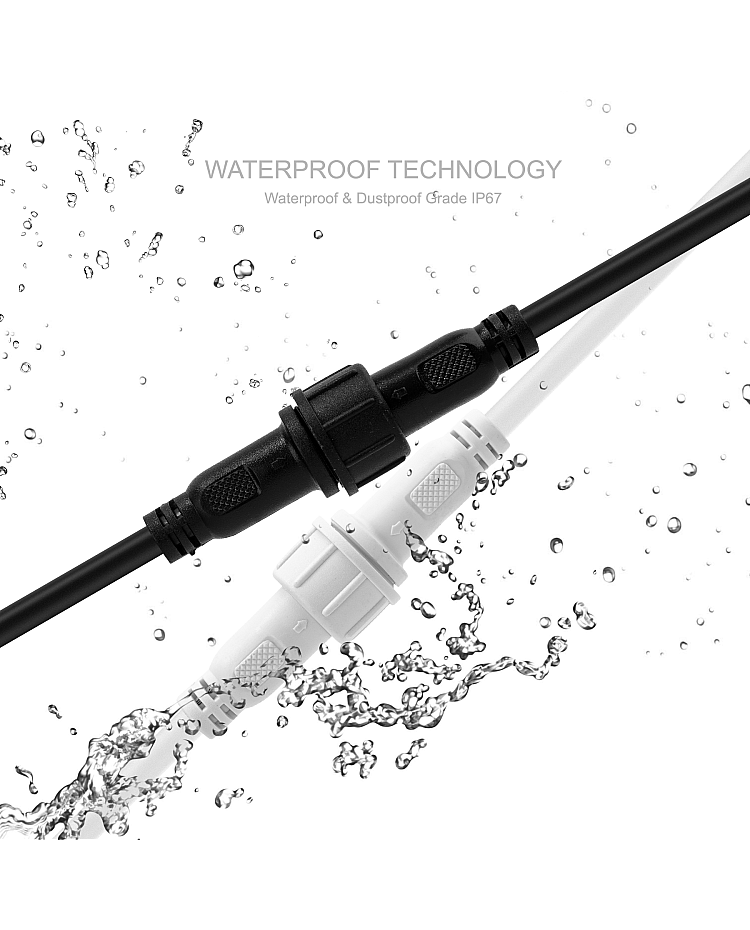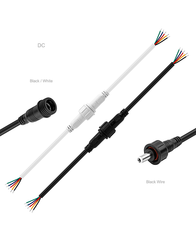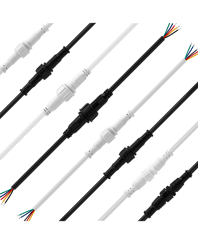 The IP67 waterproof LED connectors are designed for secure and reliable power or signal connections in demanding outdoor or wet environments. They are made of PVC and pure copper material, and have an IP rating of up to IP67. Available in DC, 2-pin, 3-pin, 4-pin, and 5-pin configurations, they support a wide range of LED lighting applications, including single-color, tunable white, RGB, RGBW, RGBCCT, and waterproof WS2812B LED strips options, suitable for use in wet, damp, or water-logged locations. The wire length is 20cm. Each connector features a robust waterproof seal with an IP67 rating and threaded screw locking design to prevent moisture, dust, and vibration from compromising the connection. Ideal for low-voltage 12V/24V/48V lights. They can also be used in hybrid, motor, car, and ship applications. Black and white colors are available.
