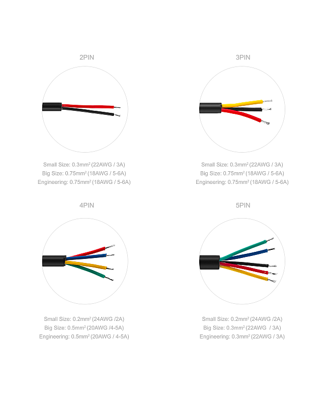 - DC 2Pin: 0.3 mm²/22AWG; allow max current: 2-3A