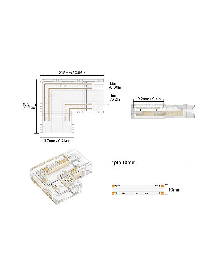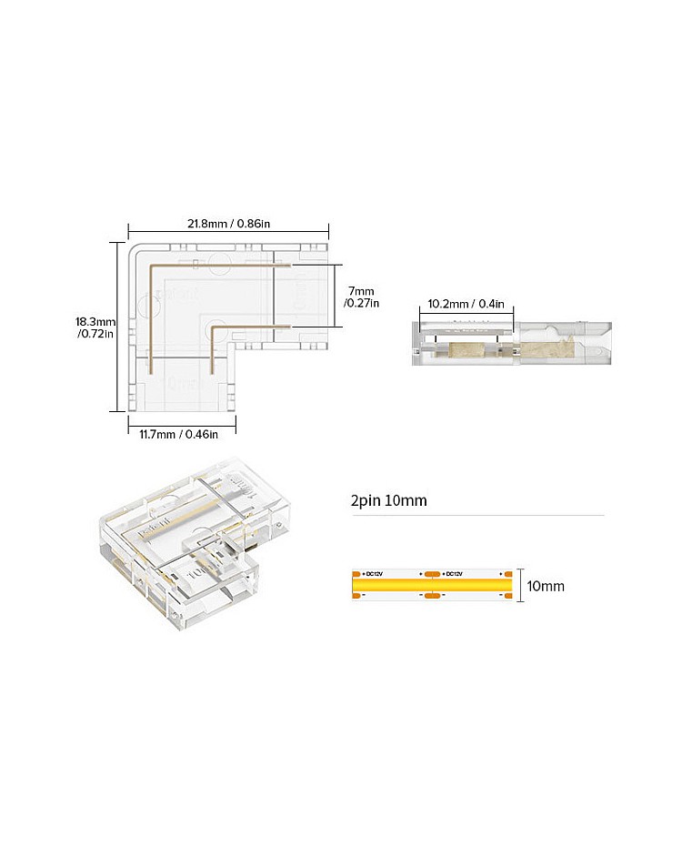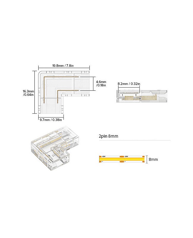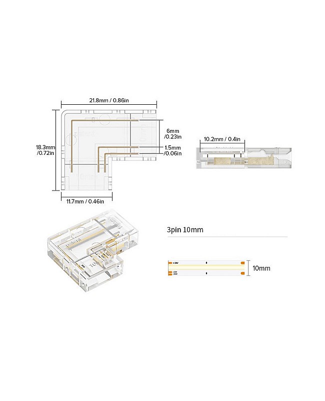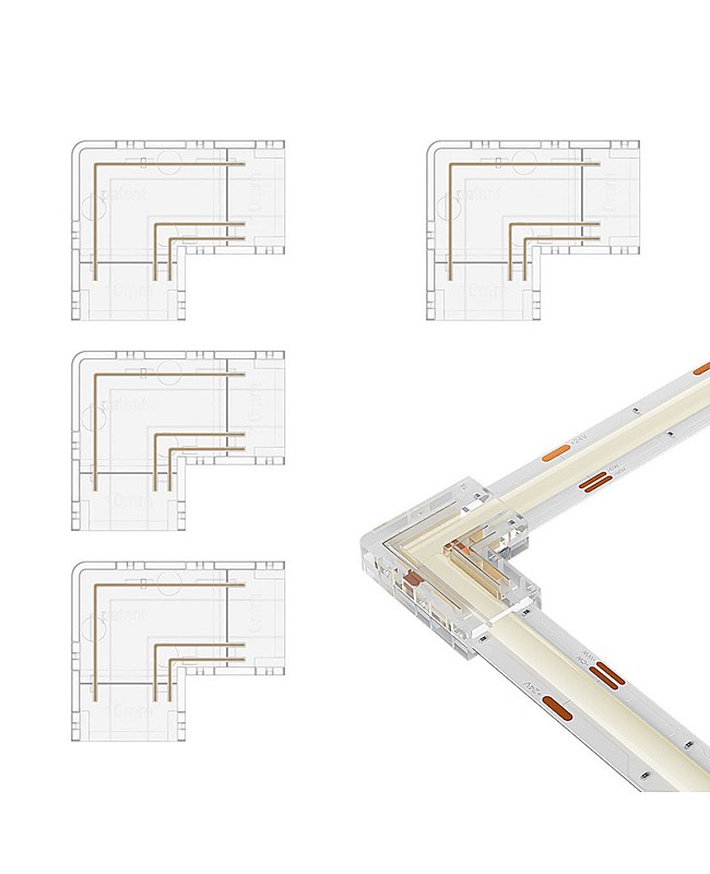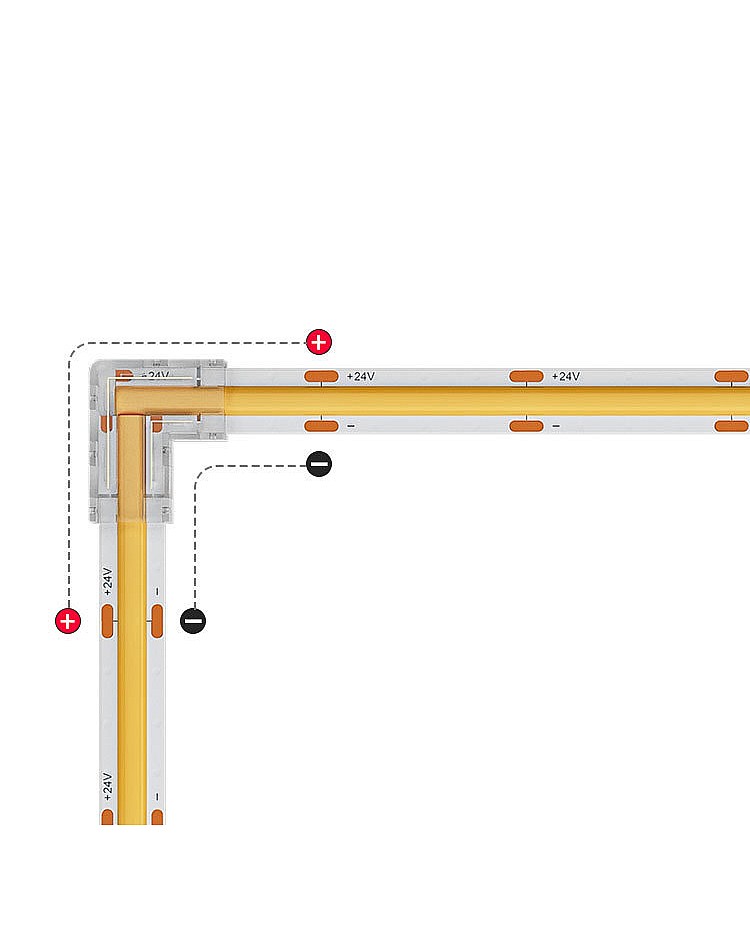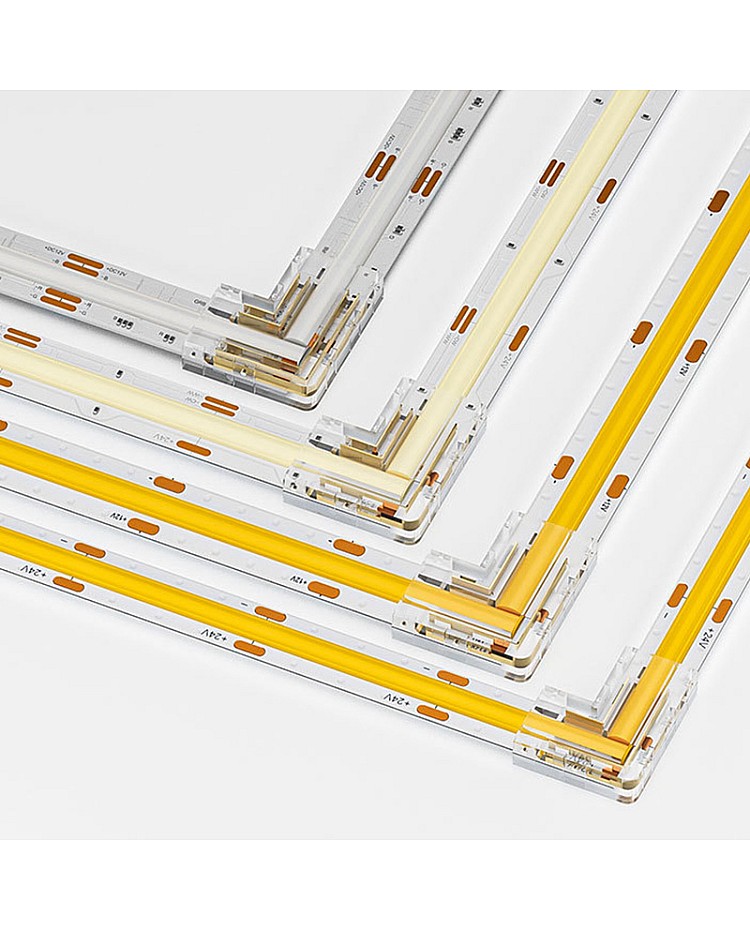 The COB LED strip light plugs have an L shape and can be used for corner installation. There are four types of LED light plugs available, and you can use 8mm and 10mm single-color COB LED tapes, 10mm tunable white COB LED strips, and 10mm RGB COB LED strips. It is easy to insert the LED strips inside the corner connectors, with no dark areas, to create a seamless line of lighting.