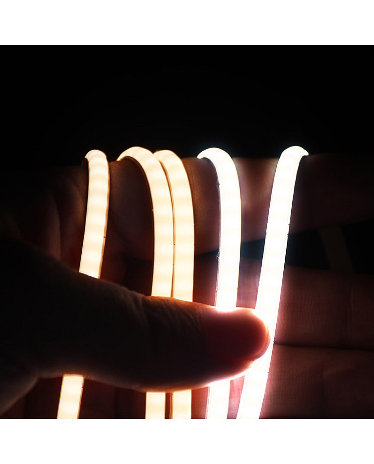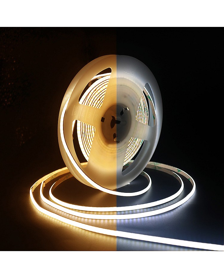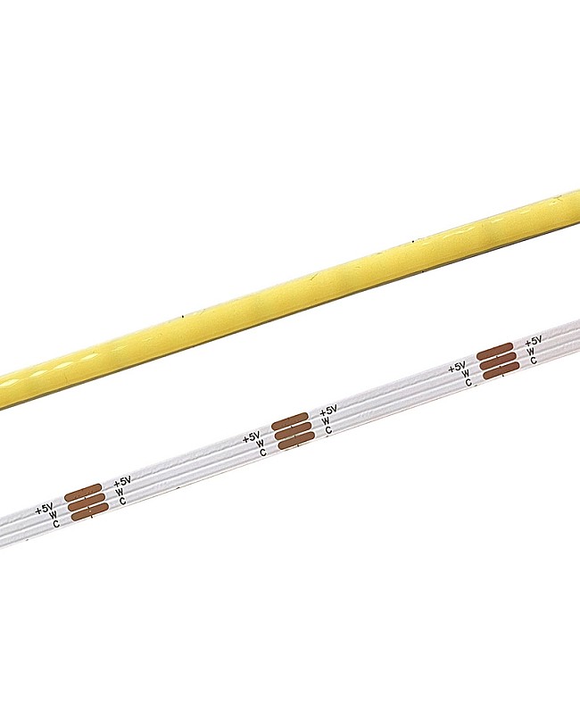 The tunable white LED COB tape, which has a super-narrow size and width of only 4mm, is designed to provide a bright, energy-efficient illumination source for various applications. They feature a dual-white color temperature, allowing users to adjust the color of the light to their needs. It works on 5VDC and can be installed in a narrow location in your cars, furniture, under-cabinets, DIY projects, etc. Use the high-quality San An 1022 LED chips as the light source, 576PCS LED chips mounted on a one-meter dual-layer flexible PCB board, flexible and bendable. The high density of LED chips creates seamless linear lighting, no visible light dots and dark areas, and uniform light emission. There are two colors of LED chips on the COB LED stripes, 2700K warm white and 6500K cool white. It can work with a CCT LED controller to adjust the brightness and color temperature from 2700K to 6500K for various scenes. The COB light tapes are cuttable; you can cut to any length for your project from the cutting points. The back has double-sided adhesive tape, and it is easy to remove the protective paper on the back of the LED strips and stick them where you want to install them. The working voltage is 5V, which can light up power banks, wall adapters, and batteries.