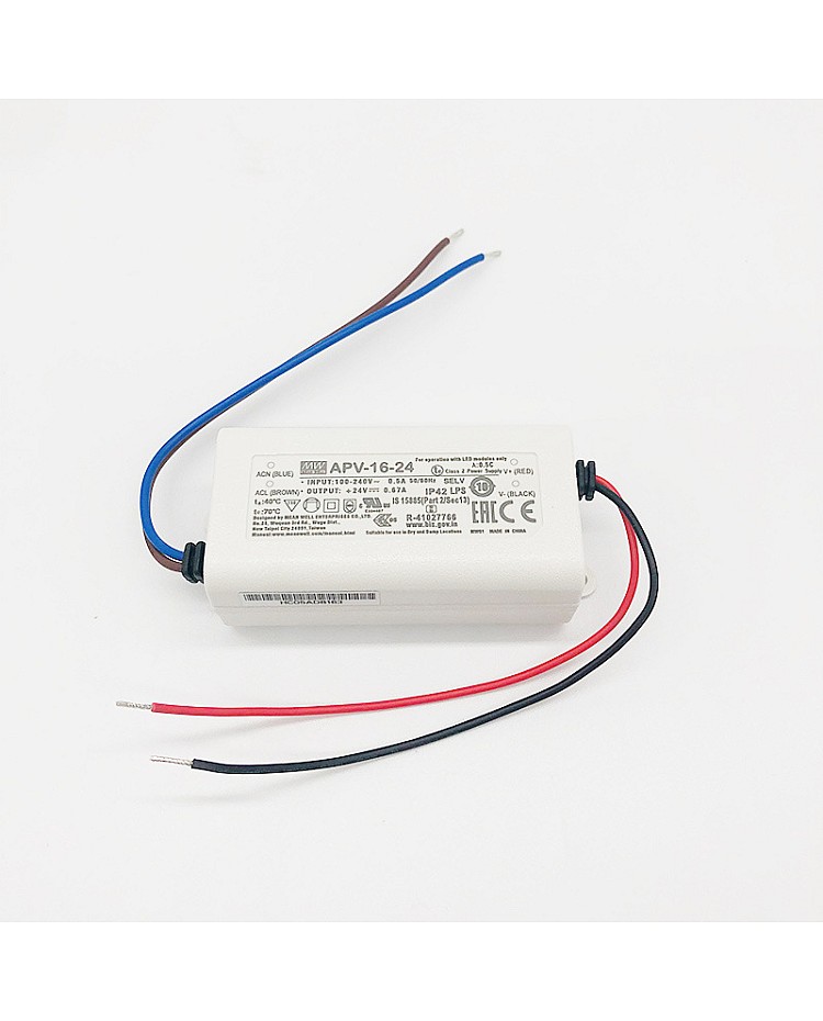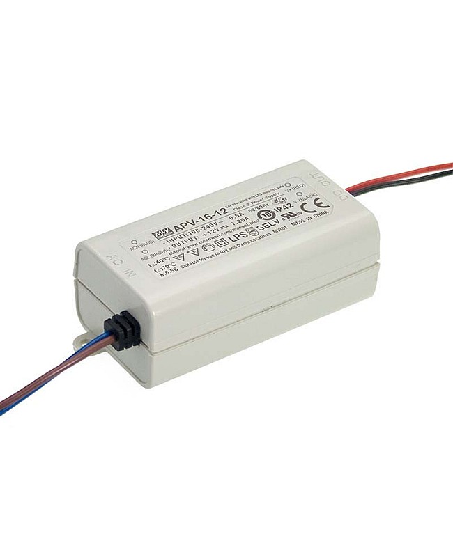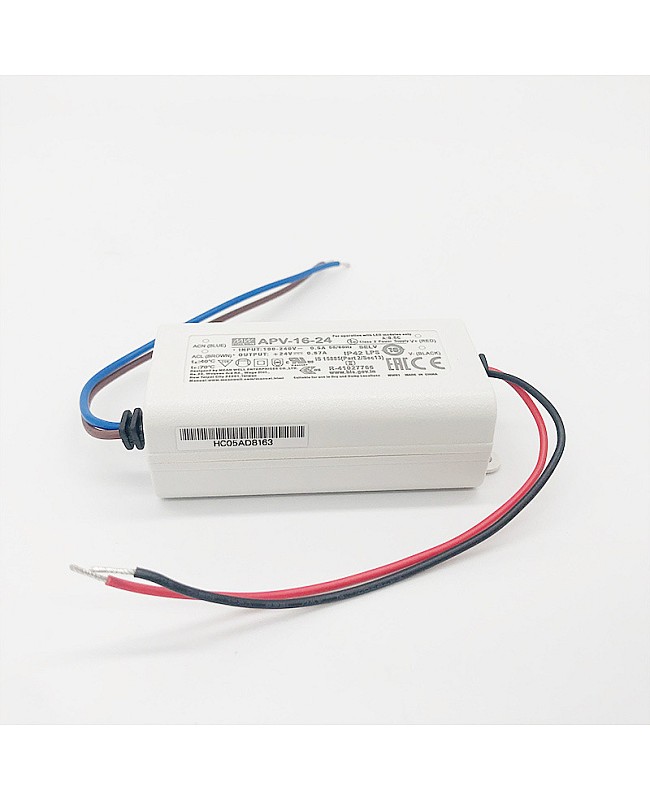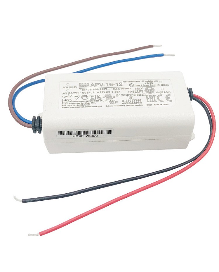 The Mean Well APV-16 switching power supplies, with a small and compact size and constant voltage design, offer DC5V, DC12V, DC15V, and DC24V products. The universal AC input range is from AC90V to AC264V, and you can connect to the public power system without an adapter. The Meanwell APV 16 has an IP42 isolated plastic case design, with multiple protection functions to ensure safety and reliability. They operate from -30℃ through 70℃ under air convection without a fan. suitable for LED fixtures, LED decorations, or Advertisement Devices.