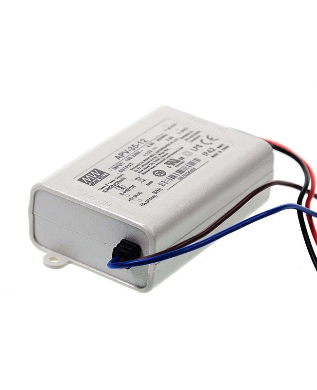 The Mean Well APV-35 DC power supply, the 35W constant voltage single-output switching power supply in a fully isolated plastic case, is suitable for LED-related fixtures, LED decoration, or advertisement devices. With a universal AC input design, the voltage range ranges from AC90V to AC264V. You can choose from various constant voltage products, from DC5V to DC36V, with a max loading power of 36W. This Mean Well will turn AC input voltage into a single-output DC voltage, with a small and compact size, you can use them in a narrow place, and they are suitable for dry and damp locations.