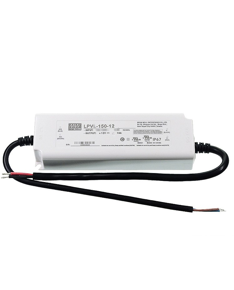 The 150W Mean Well DC power supply will change the AC Input to a DC output. There are two versions available, LPV-150 and LPVL-150. The difference is the input voltage range. the input range of LPV-150 is 180VAC to 305VAC, LPVL-150 is 90VAC to 132VAC, and various output voltage products are available from DC12V to DC48V, with constant voltage output and IP67 waterproof level design. You can use them for outdoor LED lighting. The Meanwell DC power supply is highly efficient and has a low cost. Multiple protections to ensure high reliability. You can use them in wet, rainy, or harsh locations with 2 2-year warranty.