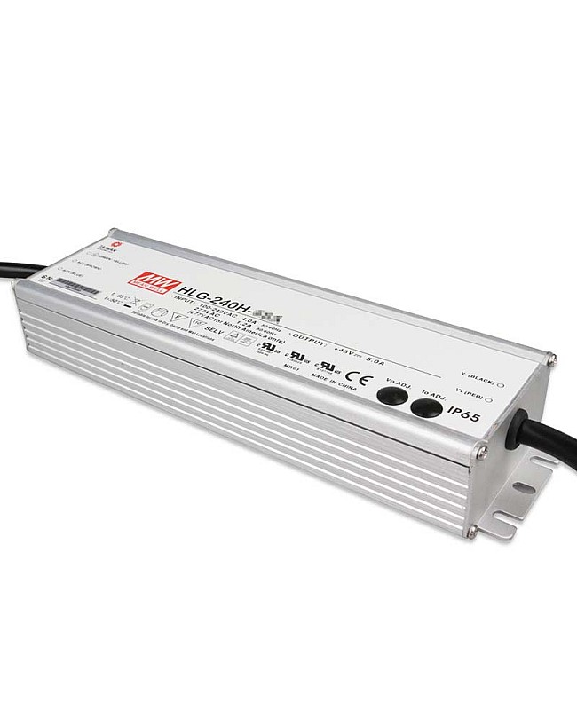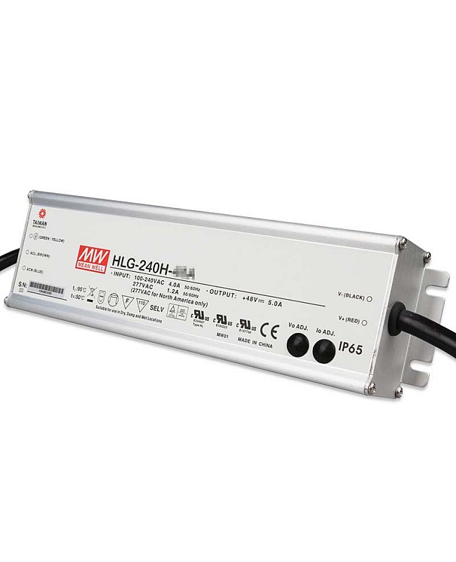 The Mean Well HLG-240H AC DC power converters, the LED converters were enclosed in a metal housing with class I design, the waterproof level can reach IP65 or IP67, only the Type C NO IP ASSIGNED, you can use them in the wet locations in indoor or outdoor for the LED street lamps, high-bay lamps, fishing lighting, greenhouse light. Five types of DC power converters are available: the A, AB, and C with output voltage and output current adjustable through the internal potentiometer, the B, AB, and D with a dimming function. The HLG-240H can operate from AC90V to AC305V and connect to the public power system without extra adapters. The high-efficiency rate is up to 93.5%. With a fanless design, the entire series of AC-DC power supplies can operate for -40℃ to 90℃ case temperature under free air convection. offers models with different rated voltages ranging from DC12V to DC54V.
