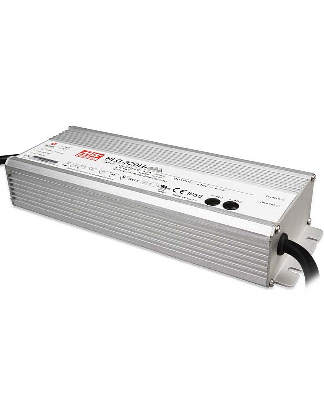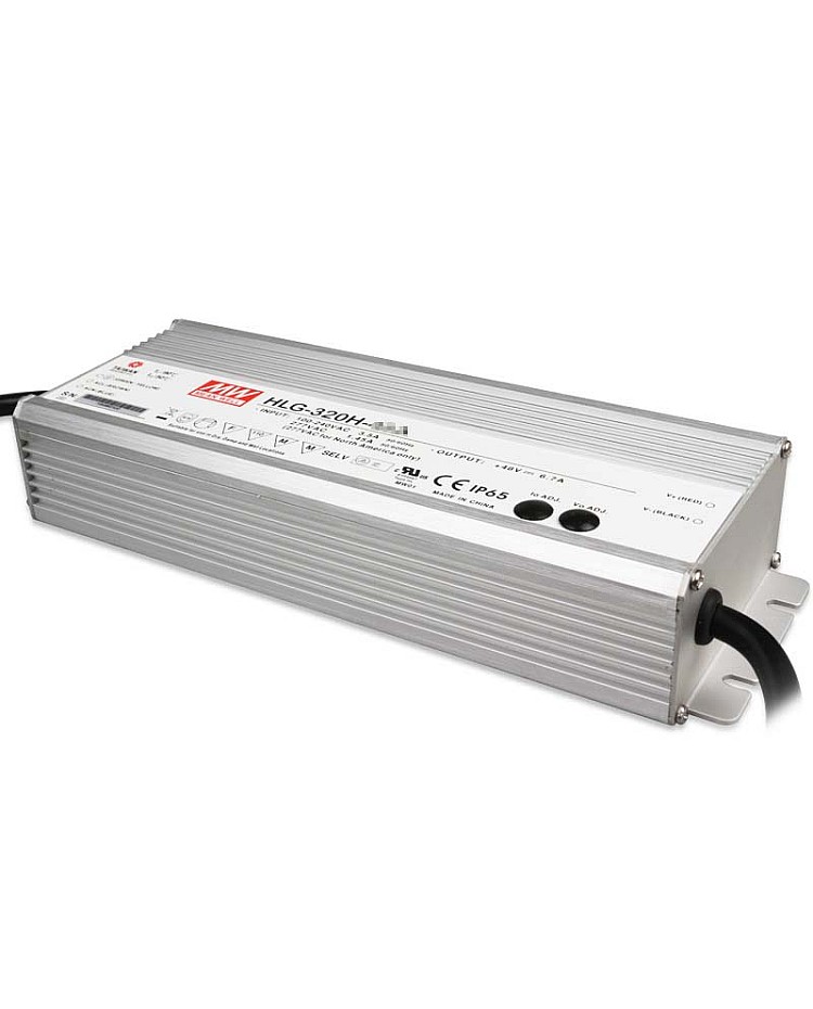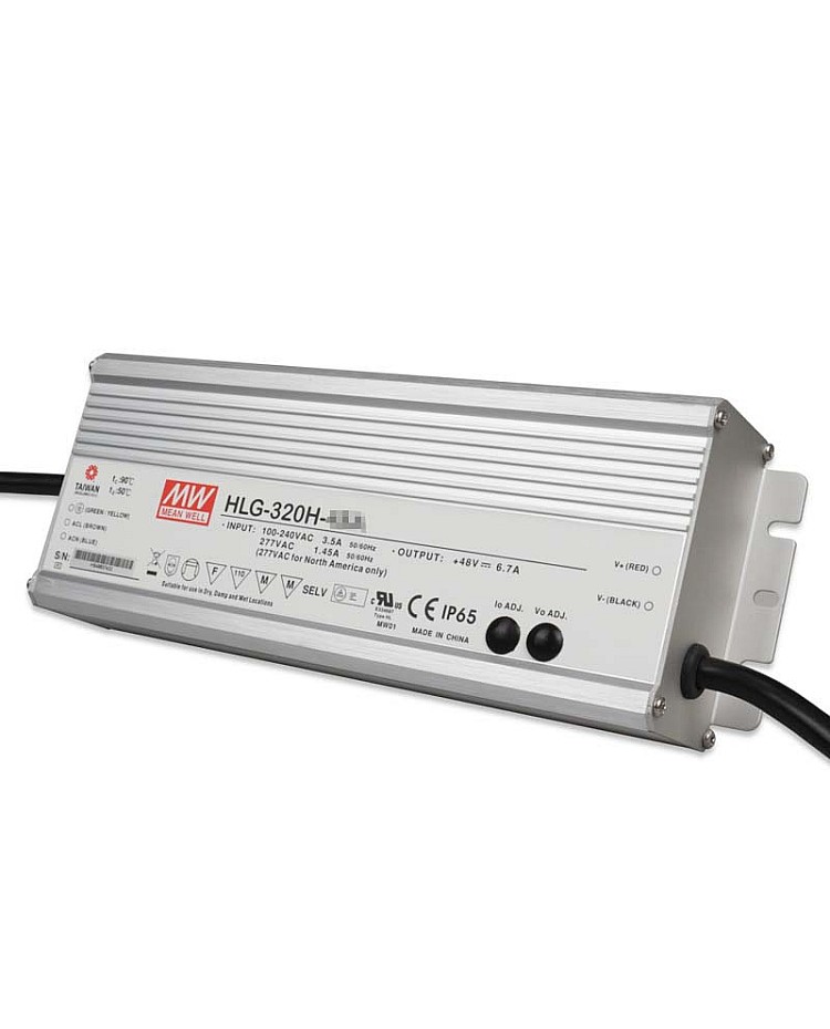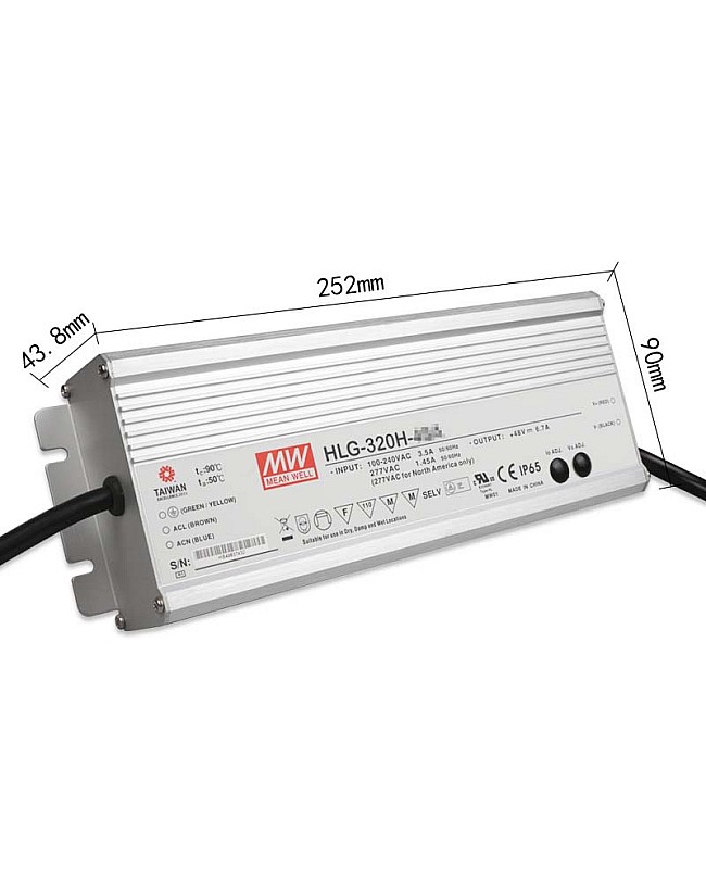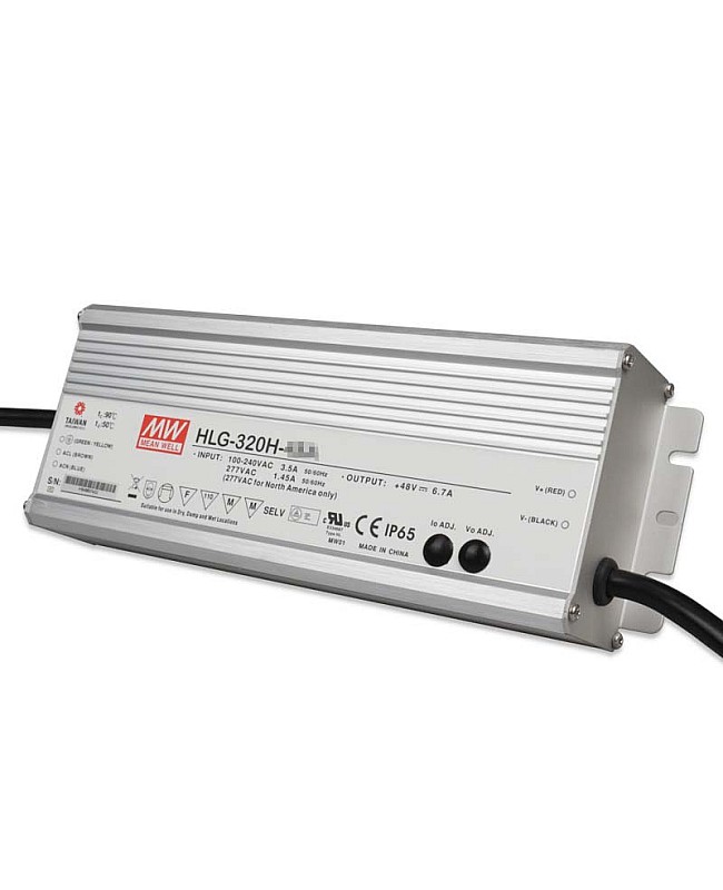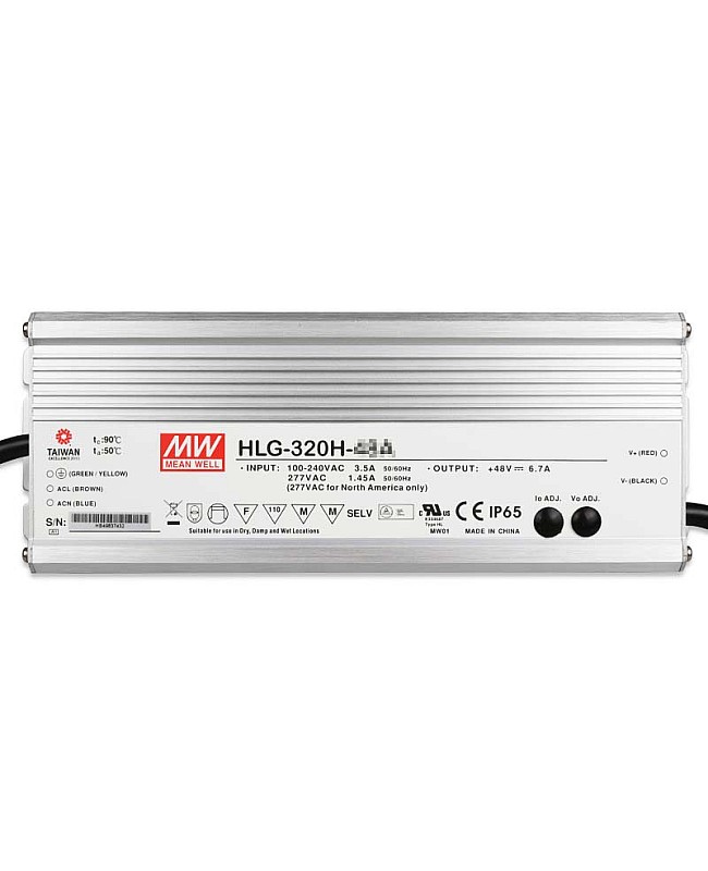 The Mean Well HLG-320H power supply for LEDs, which is enclosed in a metal housing with a class I design, has a waterproof level that can reach IP65 or IP67. You can use them for indoor or outdoor locations, making them suitable for waterproof street lights, high-bay lighting, parking lights, etc. The HLG 320H series LED power supplies have a constant voltage and current mode output design. The A, B, and C types have an output voltage and current adjustable design through the built-in potentiometer, and the B, AB, and D types have a dimming function. The AC to DC LED power supplies operate from AC90V to AC305V and offer models with different rated voltages ranging from DC12V to DC54V. With a high-efficiency rate up to 94%, without fan design, and able to operate for -40℃ to 90℃ case temperature under free air convection. The super-long lifespan of over 62,000 hours and a 7-year warranty.