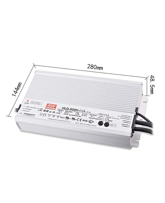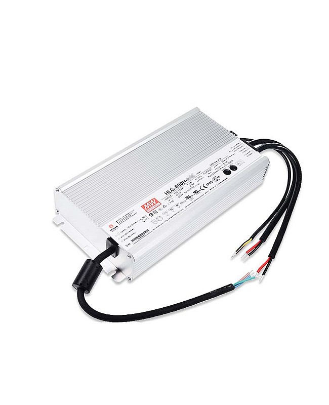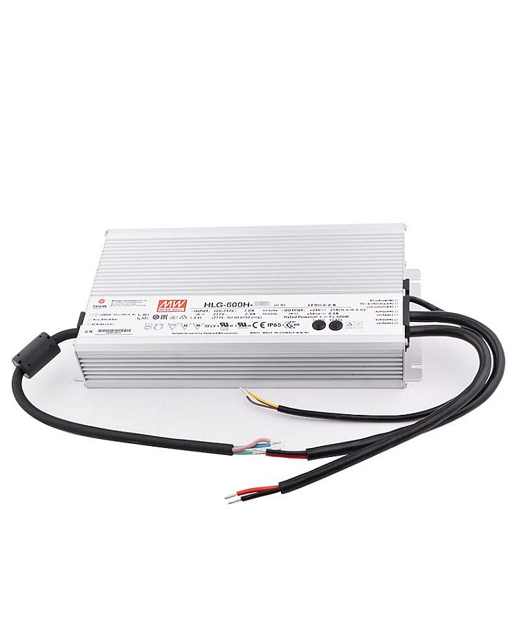 The Mean Well HLG-600H series DC adaptors, with a max loading power of up to 600W, are enclosed in a metal housing with a class I design, and the waterproof level can reach IP65/IP67. You can use them for indoor or outdoor applications. Suitable for high-bay lights, parking space lighting, fishing lamps, greenhouse lamps, etc. The HLG 600H features a dual-mode constant voltage and constant current output design. The input voltage range is from AC90V to AC305V, and it can connect to the public power system and requires no extra adapters. It offers models with different rated voltages ranging from DC12V to DC54V. Thanks to the high-efficiency rate up to 96%, the Meanwell DC adaptors can operate for -40℃ to 90℃ case temperature under free air convection with the fanless design. The A and AB types have an output voltage and current adjustable design, and the B and AB types have a 3:1 dimming function. Its lifespan is over 62,000 hours, and it has a 7-year warranty.