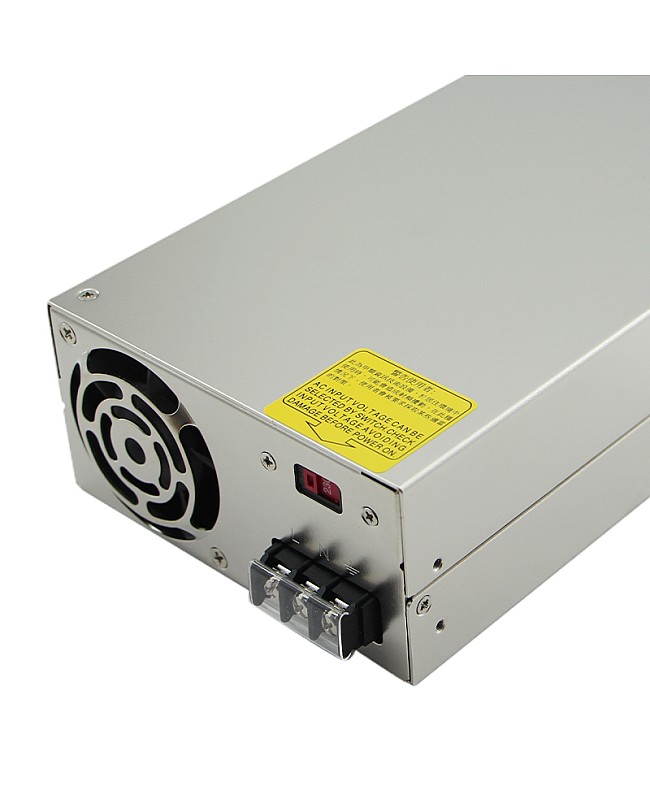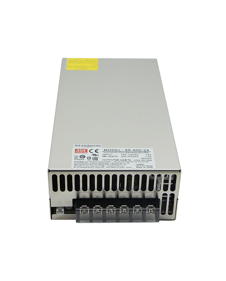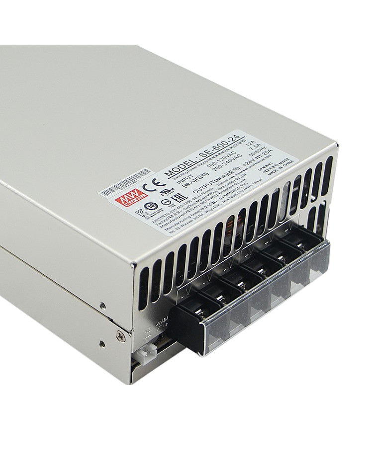 The Mean Well SE-600 AC to DC power adapter, which is a 600W single-output power supply, with a wide input range from AC90V to AC264V, is selected by a switch. The AC to DC power adapters have various output products available; you can choose from DC5V to DC48V, with a maximum loading power of up to 600W. You can use them for indoor LED lights. With multiple protections to ensure they work safely and reliably, UL approved, and a 2-year warranty. The Meanwell SE-600-48 built-in DC fan provides forced air cooling and better heat dissipation.