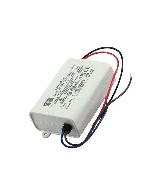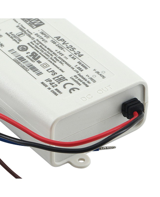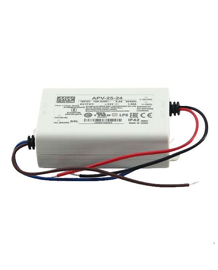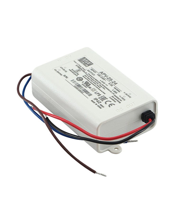 The Meanwell APV-25 power supply, with a universal AC input range from 90V to 264V, is a single-output type LED power supply with a fully isolated plastic case design. It is small and compact, suitable for LED fixtures, decoration, or advertisement devices. You can choose the various output voltage products from DC5V to DC36V. The working efficiency rate is up to 84%, and cooling is by free air convection for better heat dissipation.