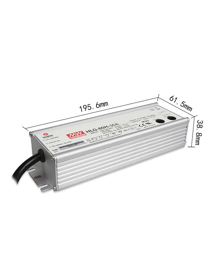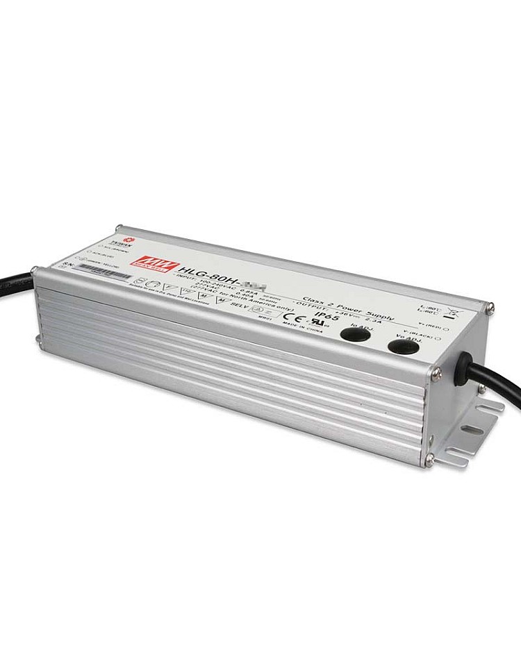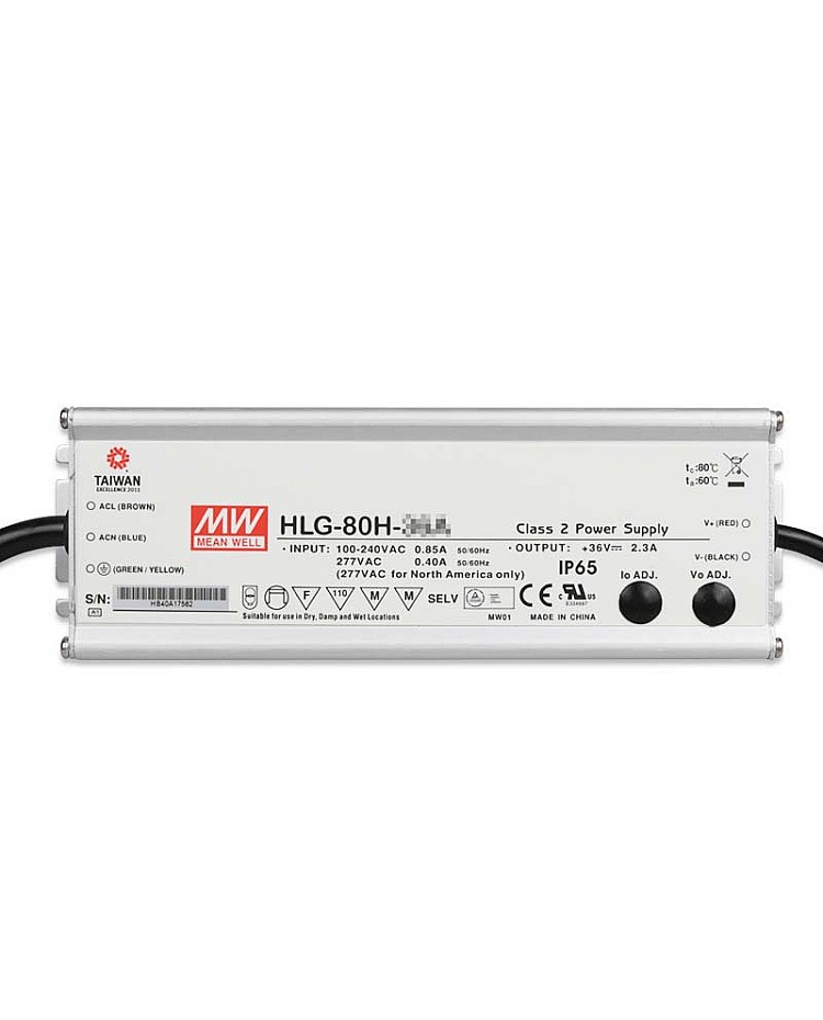 The Meanwell HLG-80H series power supplies have four waterproof power supplies available. You can choose the Io and Vo fixed products, Io and Vo adjustable products, 3 1 dimming and timer dimming products. The Types of A and AB's voltage and current adjustable through the built-in potentiometer, the universal input voltage range from AC90V to AC305V, you can connect to the public power system directly without an adapter, the HLG-80H power supplies are waterproof, you can use them in dry, damp or wet locations, you can use them for the street lights, high-bay lightings, etc.