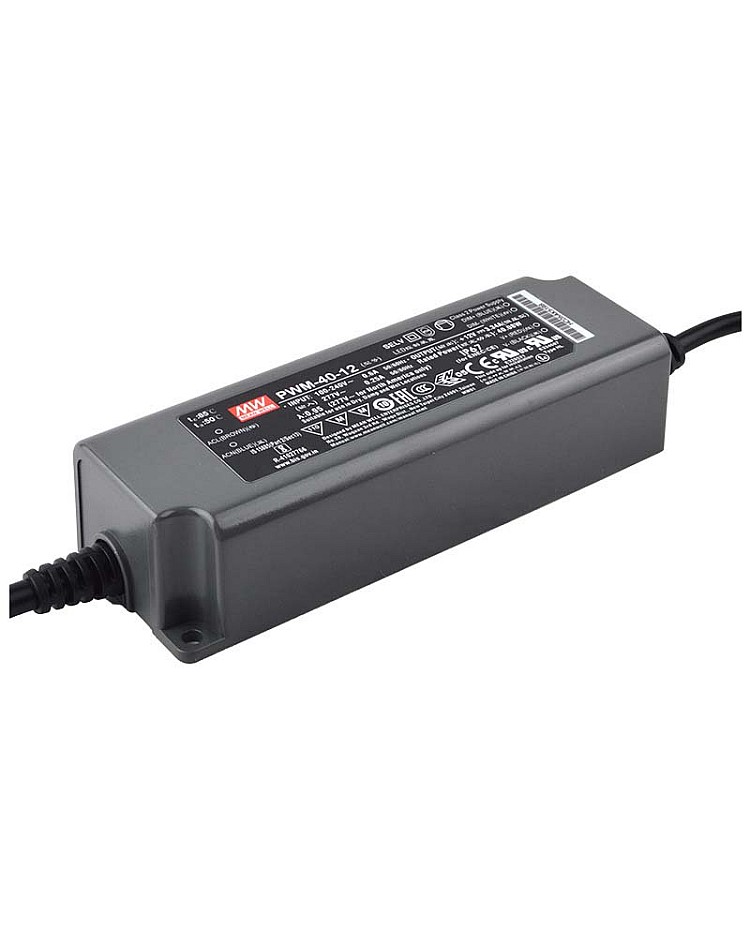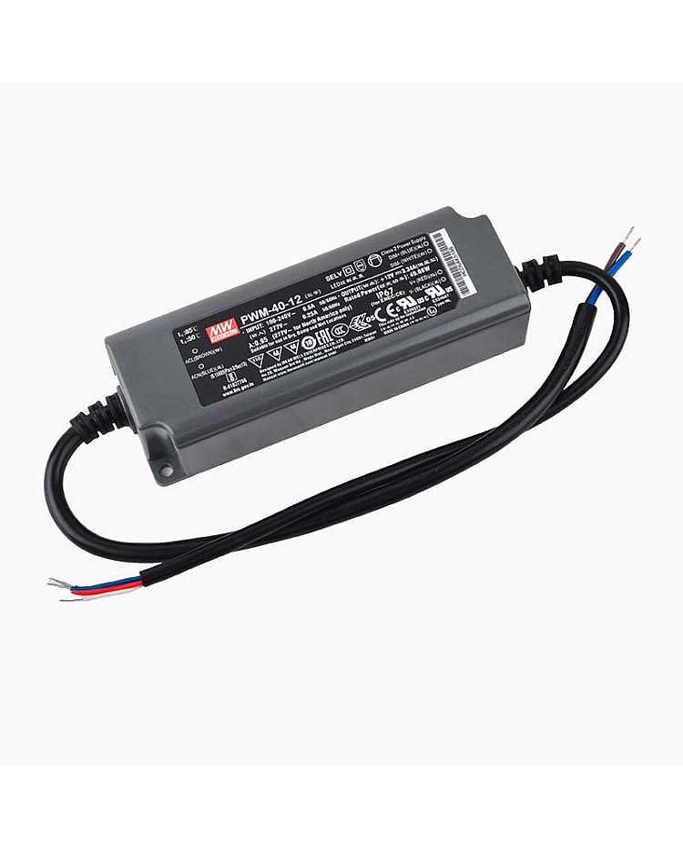 The 3 In 1 dimming Meanwell PWM 40 series waterproof power supply is a 40W AC/DC LED driver with the PWM style output, able to maintain the color temperature and the brightness homogeneity when driving all kinds of LED strips and other single color LED lights. The PWM-40 operates from AC90V to AC305V and offers models with different rated voltages ranging from DC12V to DC48V. With the fanless design, the high efficiency up to 90%, the entire series of power supplies can operate for -40℃ to +85℃ case temperature under free air convection. The PWM 40 is rated with an IP67 ingress protection level and is suitable for working in dry, damp, or wet locations. Equipped with a dimming function from 0-100% that varies the duty cycle of the output, providing great flexibility for single-color LED strip applications.