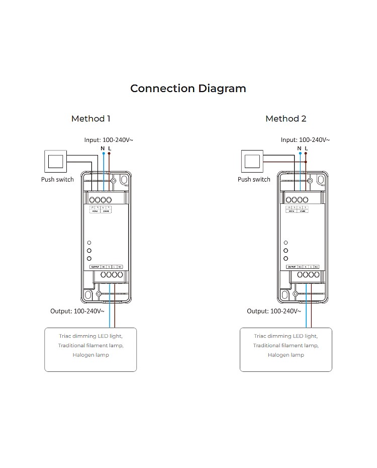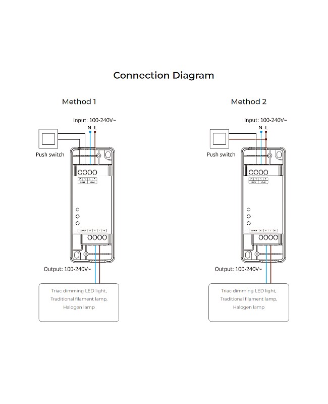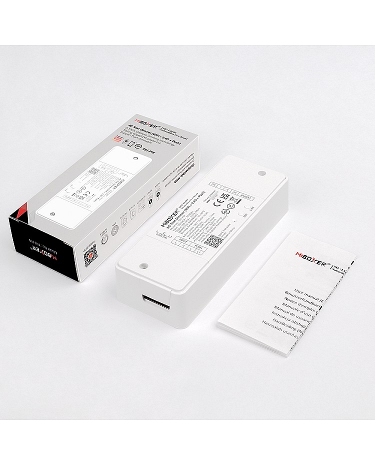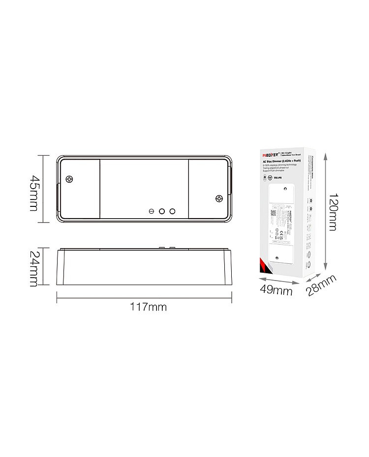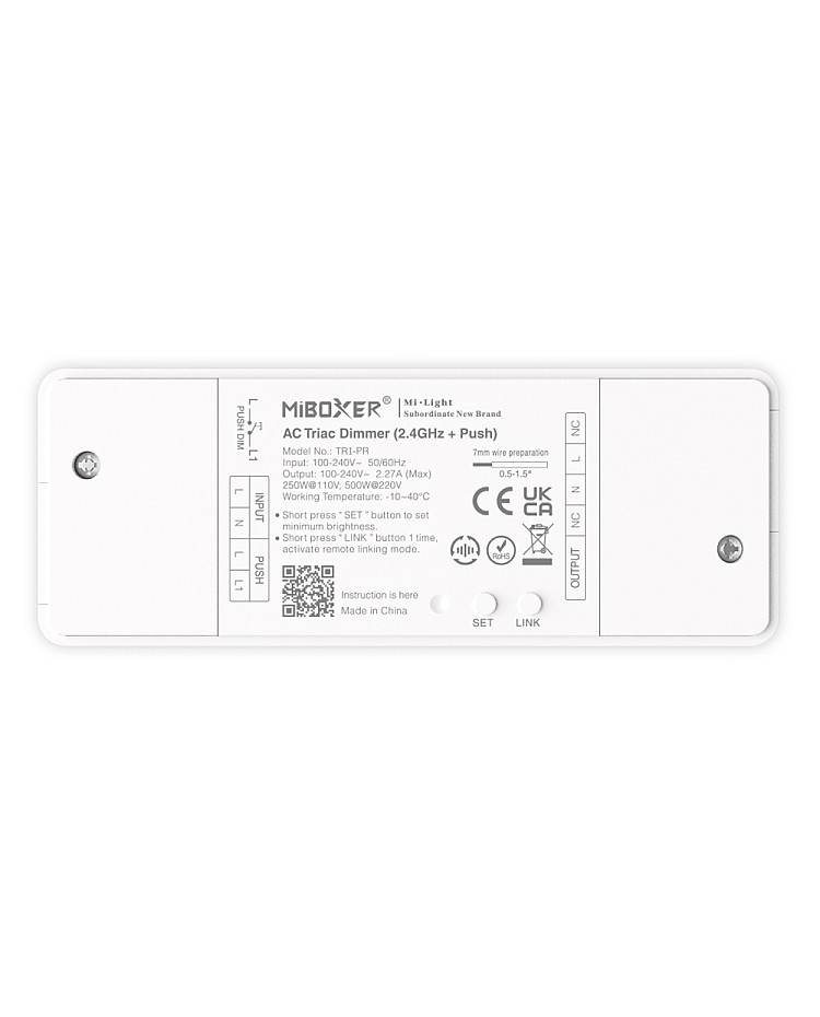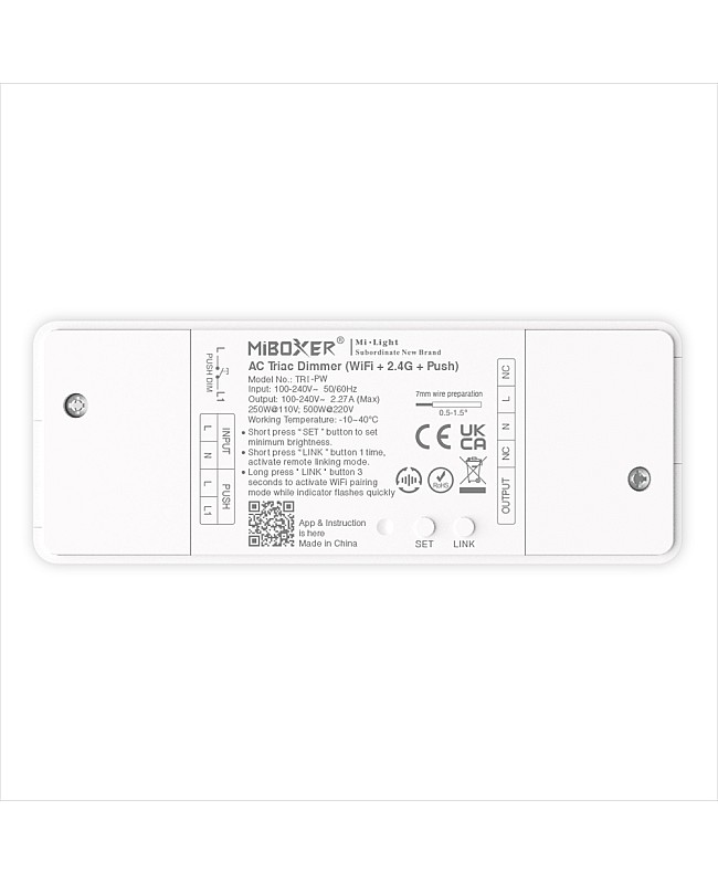 The MiBoxer 500W series RF push AC triac dimmers simplify the management of your traditional lighting. They support remote control of traditional incandescent lamps, halogen lamps, and triac dimmable LED lamps to adjust the brightness. The input voltage ranges from AC100V to AC240V, and the power does not exceed 500W. By utilizing cutting-edge phase-cut technology, those triac dimmers enable you to adjust the brightness of your lights easily and guarantee a seamless and accurate dimming experience, ensuring that your lights transition smoothly to your desired illumination level. After connecting to a wireless gateway(TRI-PR needs a 2.4G gateway, and TRI-PZ needs a Zigbee 3.0 gateway), the Tuya Smart Phone APP and third-party voice commands can control the RF push dimmers to achieve wireless dimming, group control, timing control, one-key execution, automation, etc.