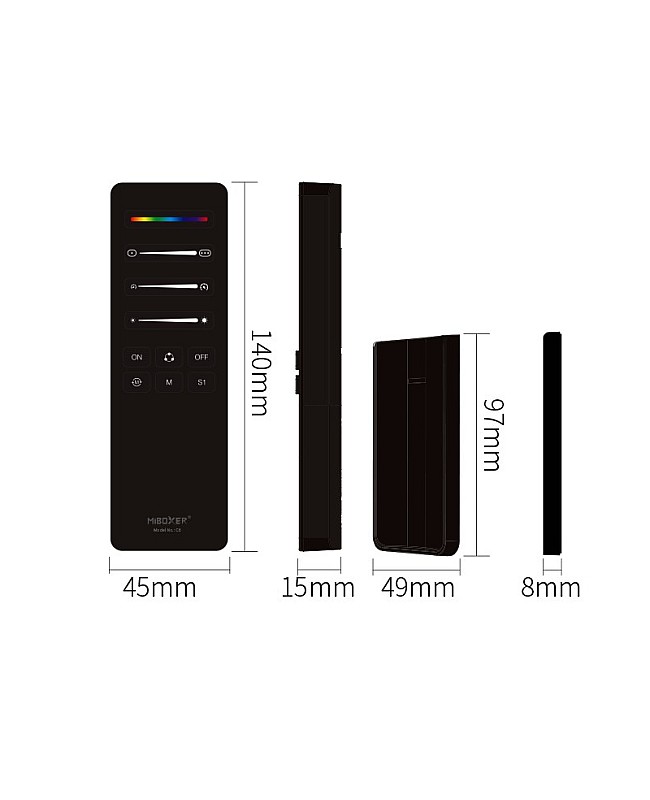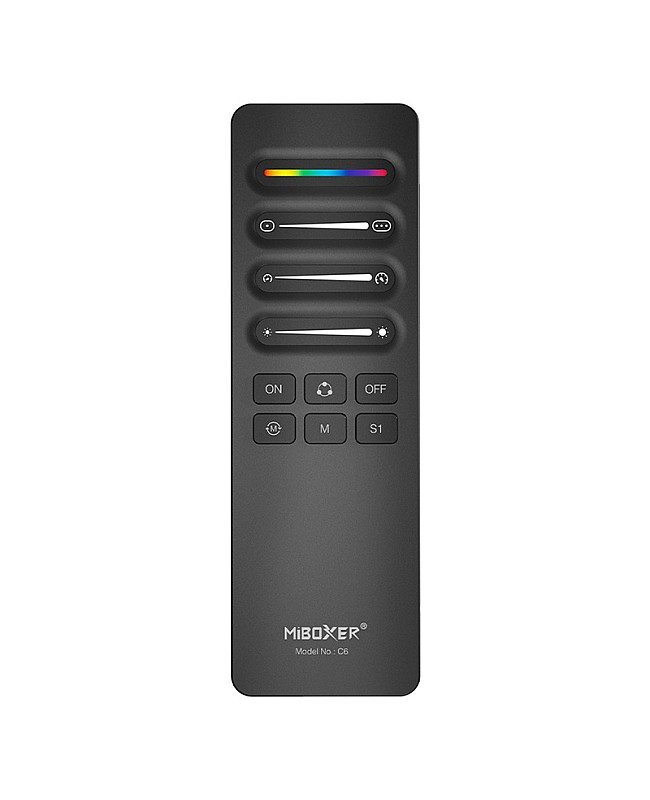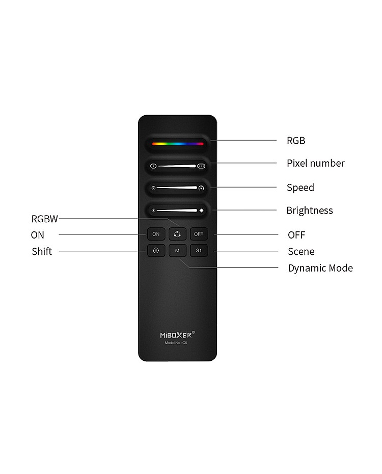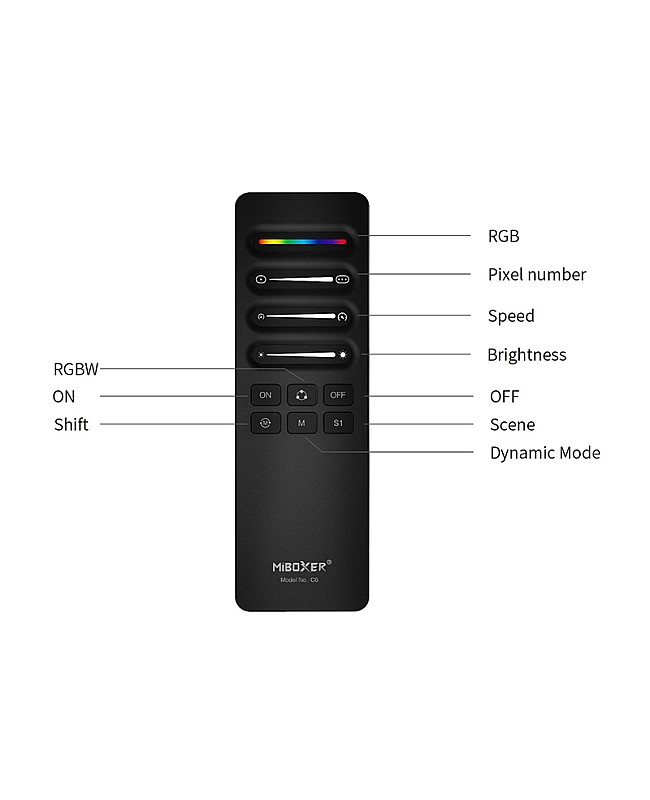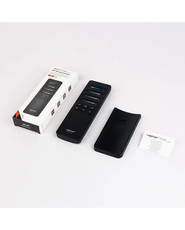 The MiBoxer C6 RF SPI remotes are designed for digital LED strips; you can use them to align the color and adjust the length of SPI LED strips, select dynamic mode, control speed, save scenes, etc. The C6 remote allows the simultaneous control of multiple devices and supports communication with various devices. You can use them to change dynamic modes or static colors, adjust brightness and dynamic lighting effects, and edit width and color for dynamic modes, etc. The MiBoxer remote adopts 2.4G wireless transmission technology with fast speed, stable signal, and strong anti-interference ability. The magnetic holder is included, which can be stuck on the walls or furniture, and the remote can be inserted into the holder to prevent loss.