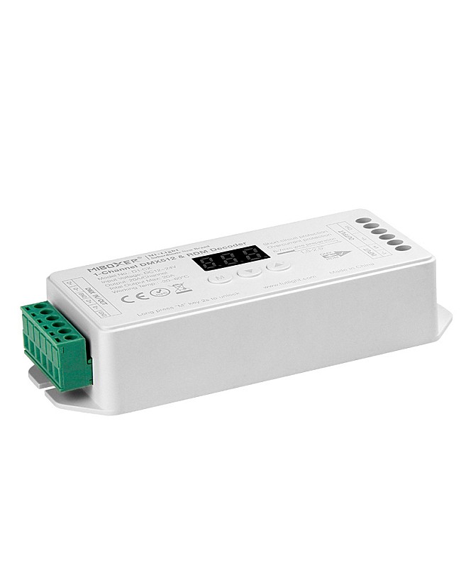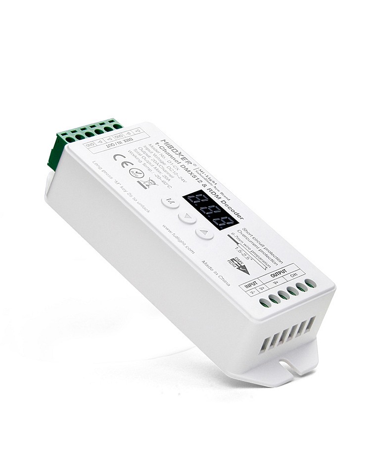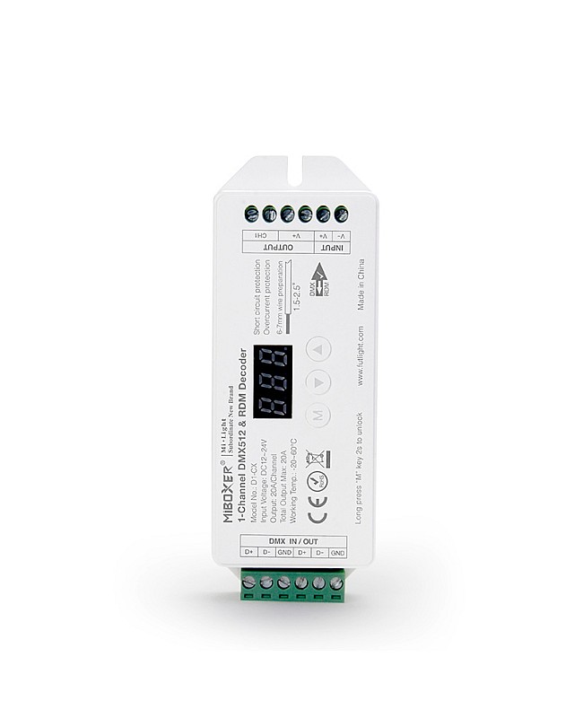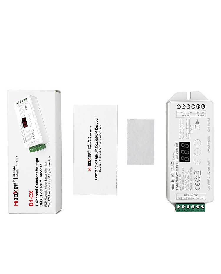 The MiBoxer D-CX series DMX512 decoder complies with DMX512, DMX512(1990), DMX512-A, and RDM V1.0 international standard protocol. Works on DC12V or DC24V, and one-channel to 5-channel products are available. The max output current is up to 20A, and the DMX512 and RDM signals can be received when in unlock status. When the digital display shows 001-512, short-press the Up or Down buttons, and you can change the DMX initial address. Long press, you can change quickly. The PWM frequency is optional. High PWM frequency(2000Hz) or low frequency(500Hz) is optional; you can press the button to switch. Dimming curves and smoothness settings are available, and you can press the buttons to switch. The MiBoxer RDM decoder has multi-protection and is designed for easy use. The IP rating is IP20 non-waterproof, only for indoor use.