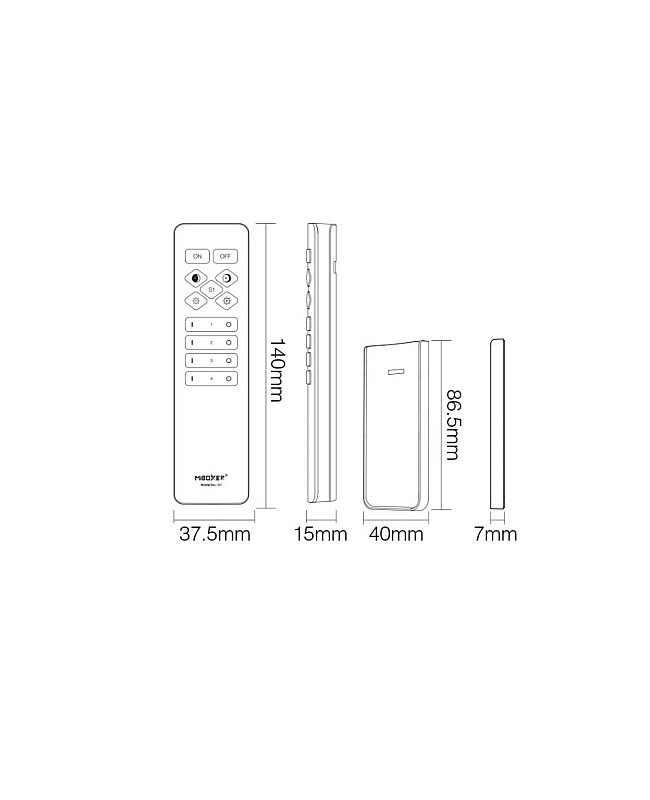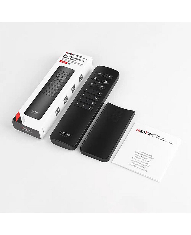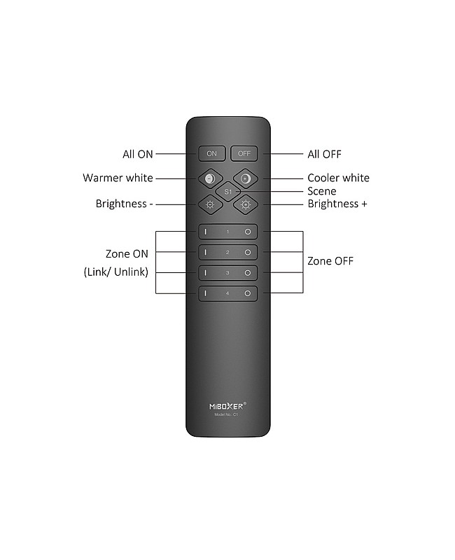 The MiBoxer dual white remote control C1 is designed for MiBoxer and Mi-Light tunable white LED lights and controllers, integrating 2.4G RF communication modules. You can use the remote to turn the lighting on or off and adjust the color temperature and brightness for various scenes. The CCT light remote has 4-zone individual control designs and a control distance of 30 meters, which allows you to control the Lights separately in multiple rooms. The strong magnetic base is included. You can take out or put back the remote on the wall easily.