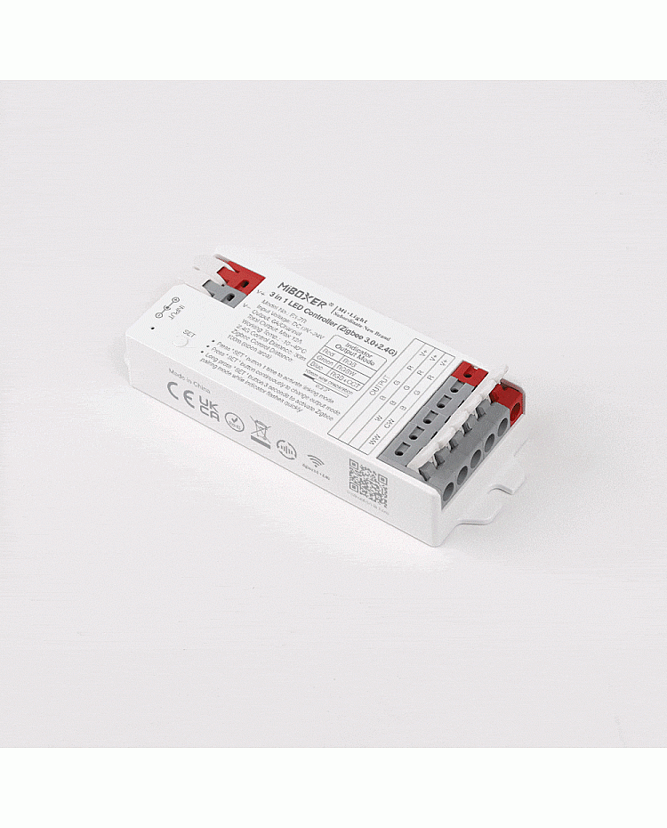 The MiBoxer E3-ZR Zigbee light strip controllers have a 3-in-1 design for RGB, RGBW, and RGB+CCT LED lights. It adopts a 2.4GHz communication module and can be controlled by 2.4G RF remote controls. And follow Zigbee 3.0 standard protocol, which can be controlled by a smartphone APP and third-party voice commands after pairing to Zigbee gateways. You can use a remote, a smartphone APP, and voice commands to choose the color and adjust brightness and color temperature for various scenes. The E3 ZR will receive signals from the remote control and transmit them to other controllers within 30 meters, and different controllers can work synchronously. You can download the APP " Tuya Smart " to your smartphone to achieve more functions like scene customization, music rhythm, timing, device sharing, etc. The MiBoxer Zigbee controller can connect to other Zigbee gateways like Philips Hue, IKEA TRADFRI, and Amazon Echo. The Zigbee controller with tool-free instant wiring design is super easy to connect to the power supply and LED lights without any necessary tools.