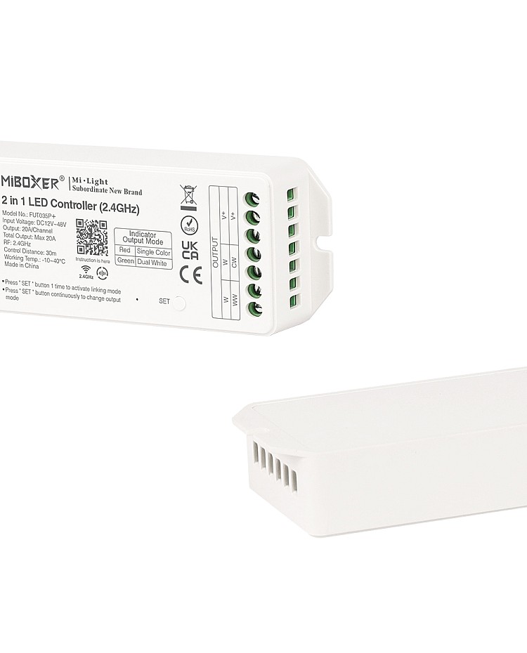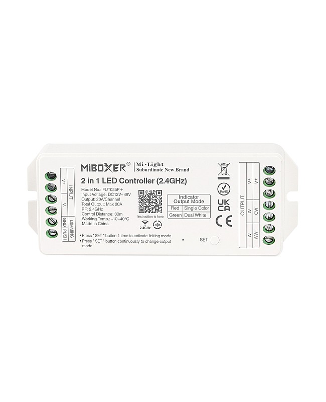 The MiBoxer FUT035P+ smart light switch dimmer is a smart device that allows you to control the brightness and color temperature of the LED Lights in your home and office, with a smooth transition without flicker. It's an excellent solution for single-color or dual-white lighting. The controller has a " SET " button; you can press the button to switch the output mode from single color to dual white. The max output current is up to 20A, allowing you to connect more LED lights. The MiBoxer smart dimmer integrates a 2.4G communication protocol and can be controlled by MiBoxer or MiLight single color and dual white LED remote controls. You can use a remote to control ON/OFF and adjust brightness and color temperature for various scenes. The FUT035P plus dimmer can transmit the signals from the remote control to other same dimmers within 30 meters, and the remote control distance can be limitless. All of the dimmers will work synchronously. After matching to a 2.4GHz gateway, you can use a smartphone APP and third-party voice commands to control the light dimmers, which can work with Amazon Alexa and Google Assistant. Supports push dimming, stepless dimmable without any screen flickering.