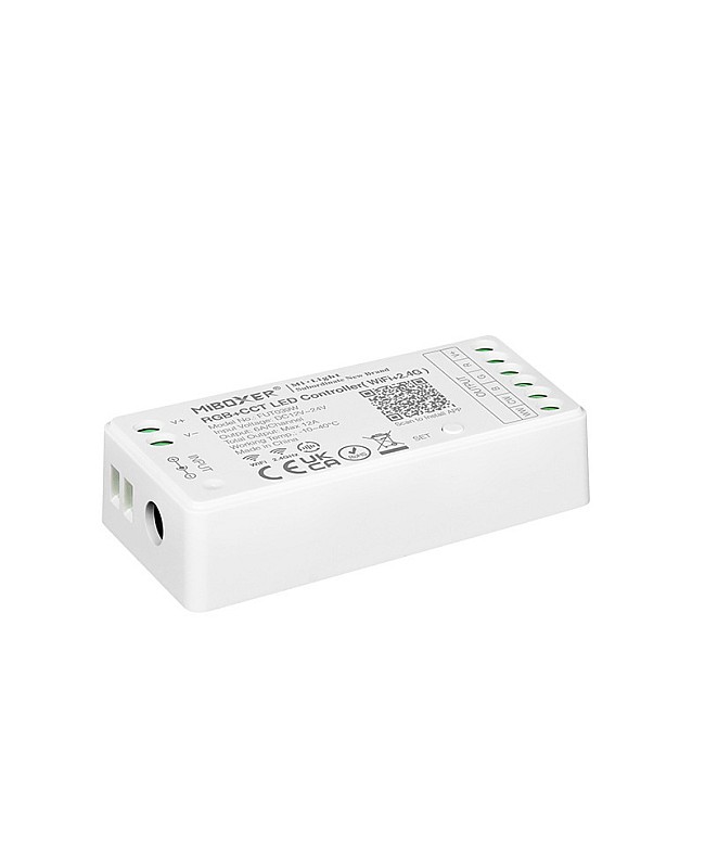 The MiBoxer FUT039W RGBWW LED strip controller is designed for the RGB+CCT LED strips. It has a WiFi and Bluetooth dual-module design, can be controlled by 2.4G RF remotes, a smartphone APP, and third-party voice commands. You can set the static color and adjust the color temperature and brightness. There are 16 million colors available. The controller will receive the signals from the remote control and transmit them to other controllers within 30 meters, and different controllers will work synchronously. The 24V RGBWW controller supports music rhythm and timing functions, and the LED lights will dance with the rhythm of the music. You can set the opening and closing time according to your lifestyle, and you can set the fade out/fade in of lighting before falling asleep or waking up. The RGBWW controllers are non-waterproof and only recommended for indoor applications.
