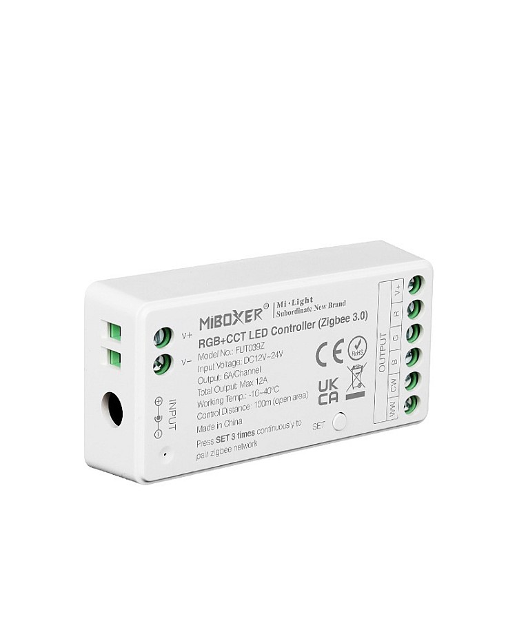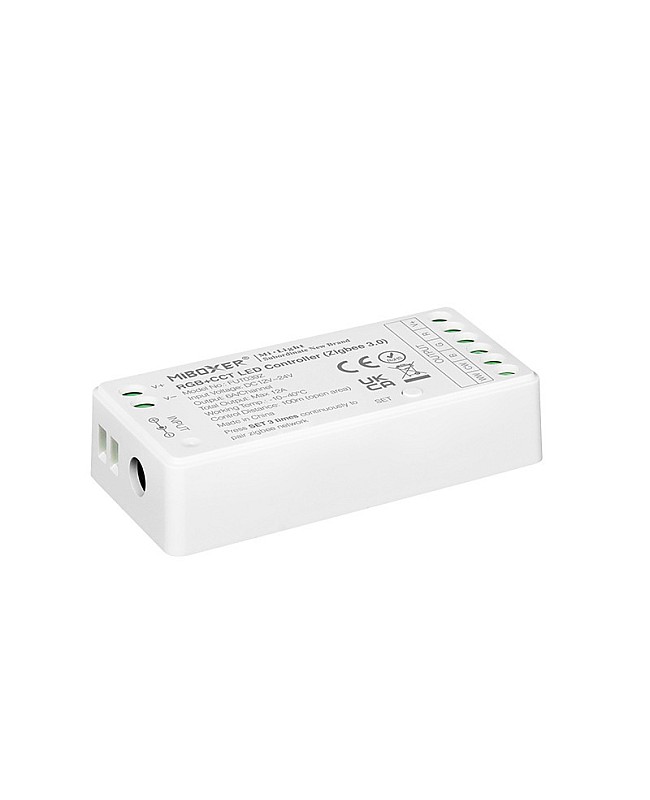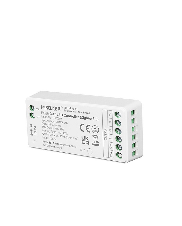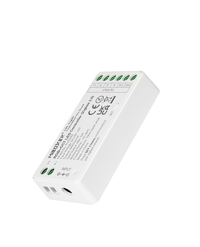 The MiBoxer FUT039Z RGB+CCT LED strip controller integrates the Zigbee 3.0 standard protocol, can be controlled by a Zigbee remote, a smartphone APP, and third-party voice commands. You can set the color and adjust the brightness, color temperature, and saturation. There are 16 million colors available, and the color temperature can be adjusted from 2700K to 6500K, and brightness can be adjusted from 1% to 100% for various scenes. It can work with RGBWW LED lights, including LED tapes. The MiBoxer Zigbee controller can enter other Zigbee 3.0 gateways like Philips Hue, IKEA TRADFRI, and Amazon Echo Series. After adding the MiBoxer Zigbee gateways, a smartphone APP can control the Controllers, and you can download the APP from Apple Store or Google Store to achieve more functions like timing, device sharing, sleep/wakeup plan, scene customization, and other functions. The Zigbee 3.0 RGBWW LED controller is small and lightweight, and it is easy to install and use for indoor applications.