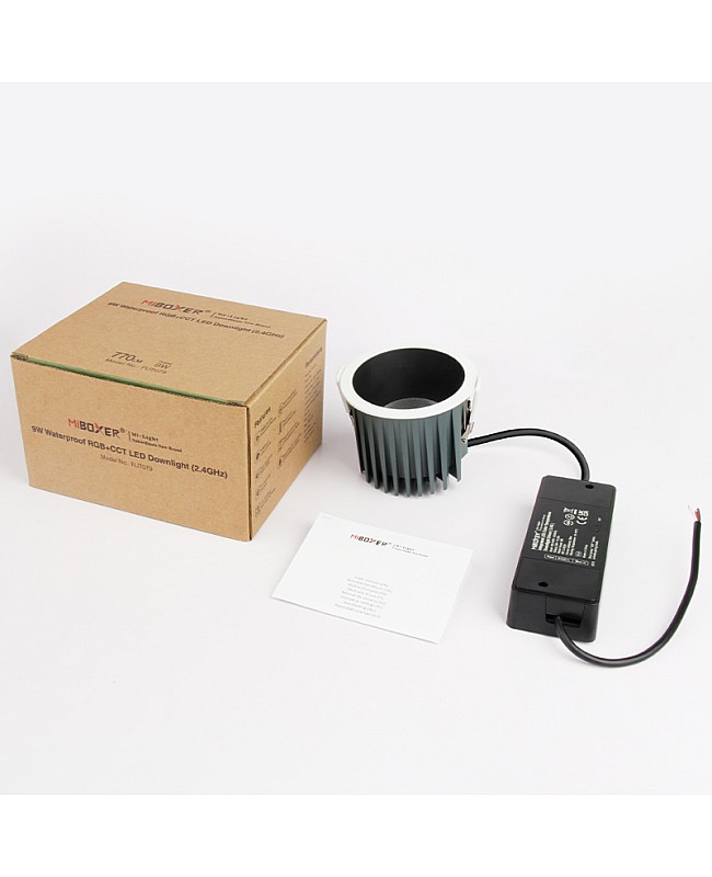 The MiBoxer FUT079 waterproof recessed lights have an IP rating of IP54 and are designed for use in wet environments and outdoors, such as bathrooms, kitchens, and under eaves. The waterproof downlights utilize a single 9W RGBCCT high-CRI COB LED chip as the light source and come with a power adapter, making installation and use easy. They are integrated with 2.4G wireless transmission technology. They can be controlled by MiBoxer remotes to adjust changes to the color, dynamic modes, and color temperature and brightness for various scenes. The FUT079 lights will receive signals from the remote and transmit them to the same model downlights within a 30-meter range, allowing all lights to work in synchronization. After pairing with a 2.4G gateway, the RGB+CCT downlights can be controlled by the Tuya Smart APP and third-party voice control to achieve additional functions, such as timer and group control.