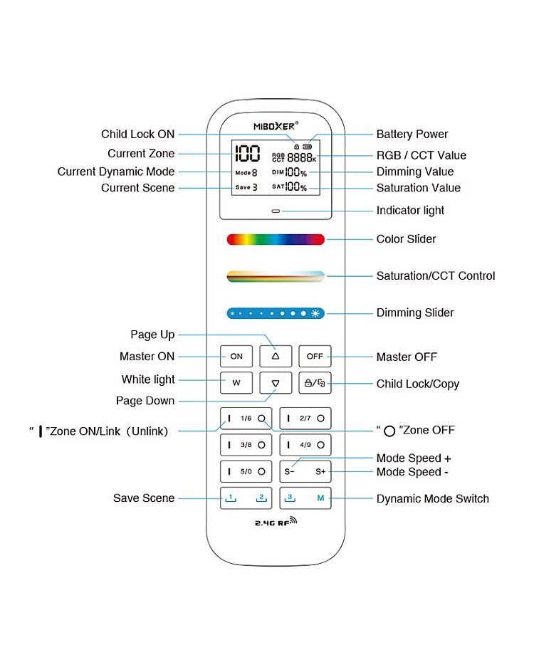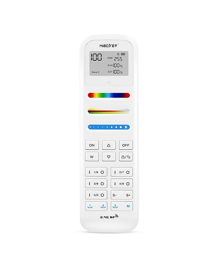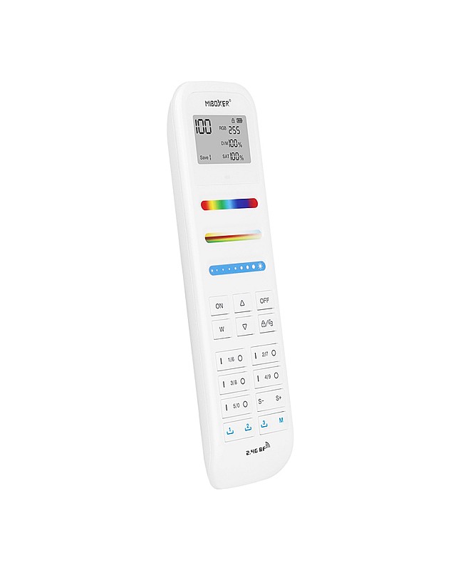 The MiBoxer FUT100 room remote control with a 100-zone design allows for the simultaneous control of up to 100 different zones. Compatible with MiBoxer or Milight RGB+CCT LED lights to set the color and adjust the brightness, color temperature, and saturation. The LCD will show you the dimming, color, situation status, and zone number. The FUT100 supports saving three favorite colors or dynamic mode, and the lamp should be over 2.0 or higher. A new copying function directly copies the linked remote and control lights without a new pairing process. The MiBoxer LED light control remote uses a 2.4 GHz frequency, a GFSK control method, and long-distance transmitting up to 30 meters. Strong anti-interference and fast communication rate. With a child lock design to help prevent the wrong operation.