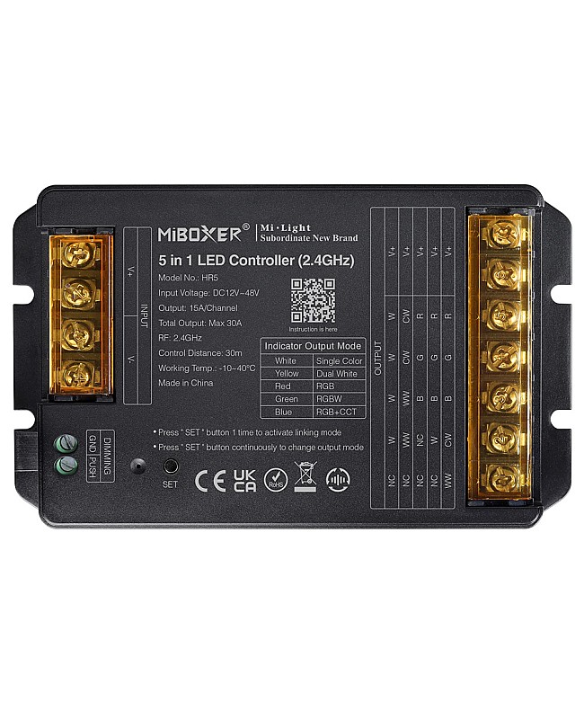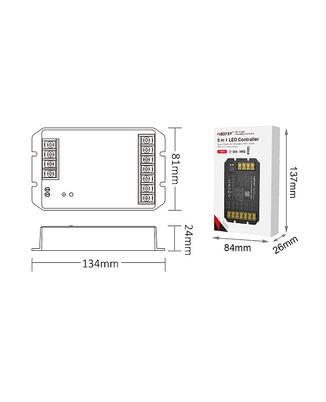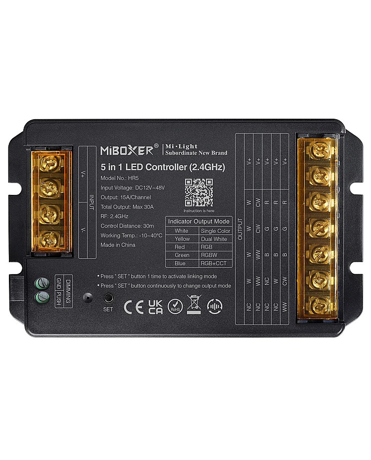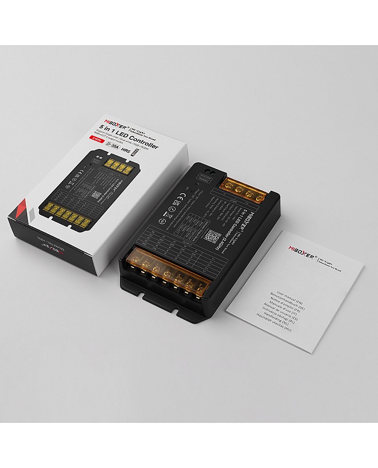 The MiBoxer HR5 is a 5 in 1 RF lighting controller for single color, dual white, RGB, RGBW, and RGBWW strip lights. The max output current is 30A, which can support more LED lights. It adopts the widely used 2.4G wireless technology, low power consumption, long signal transmitting distance, and strong anti-interference. Compatible with MiBoxer 2.4G remotes to choose the color and adjust the color temperature, brightness, and saturation for various scenes. With an auto-transmitting and auto-synchronizing design, one controller will transmit the signal from the remote to another within 30 meters, and all of them will synchronize. After pairing with a 2.4G gateway, the Tuya smartphone APP and third-party voice commands can control the controllers. It supports Amazon Alexa and Google Assistant. There is a small physical button on the controller. Press it to switch the output mode from brightness, CCT, RGB, RGBW, and RGBWW output modes. There are HW5 5 In 1 WiFi Tuya LED controllers available.