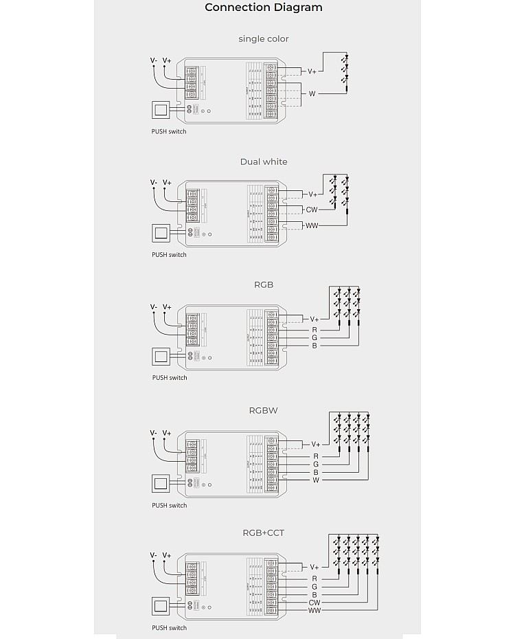 - Switch 5 Output Modes Via One Physical Button(Single Color/Dual White/RGB/RGBW/RGB+CCT)