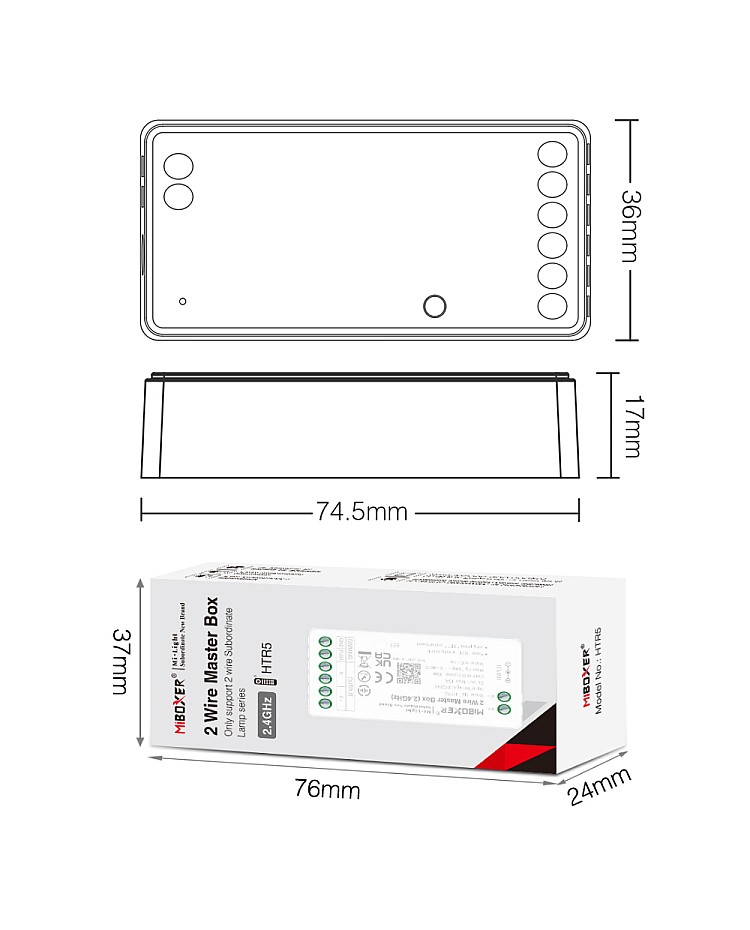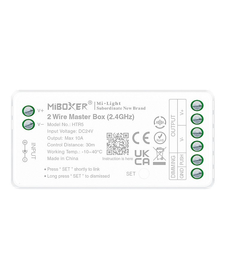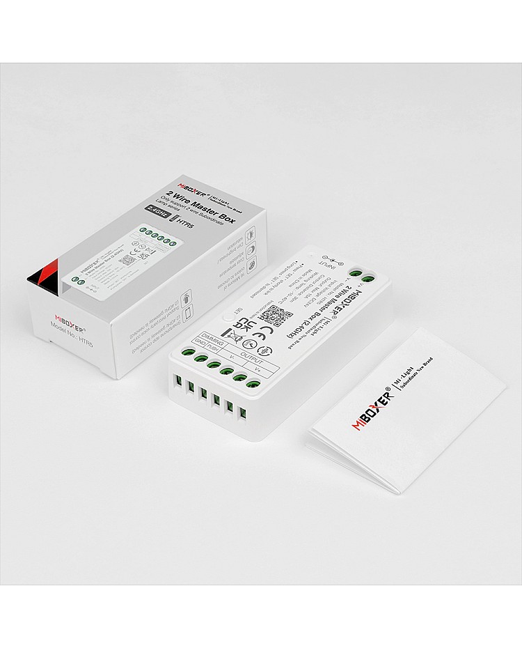 The MiBoxer HTR5 2-wire master box controllers have a two-wire design to reduce cables, reduce costs, and connect quickly. The 2-Wire controllers adopt the widely used 2.4GHz wireless technology that MiBoxer remote controls can control to set the color and adjust the brightness for various senses. One remote control can control many HTR5s at the same time. After pairing with a 2.4G gateway, the 2-wire controllers can be controlled by a smartphone APP and voice commands.