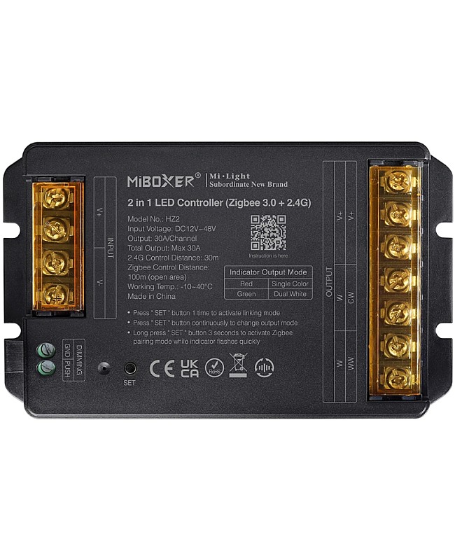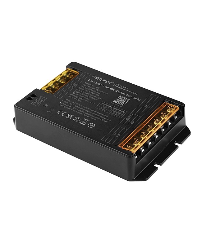 The MiBoxer HZ2 is a high-power LED dimmer with a 30A output current and a max loading power of up to 1440W. It features a 2-in-1 design, allowing for single-color and dual-white LED lights, which can be adjusted to suit various scenes by changing the brightness or color temperature. The MiBoxer high-power light dimmer utilizes Zigbee 3.0 and 2.4G wireless transmission technology, enabling low power consumption and a strong ability to resist interference. MiBoxer 2.4G remote controls can control it and will automatically forward the signal to another controller within 30 meters. All controllers will work in synchronization, and the control distance of the remote control is virtually infinite. After pairing with Zigbee 3.0 gateways, the device can be controlled by the Tuya Smart App and third-party voice commands to adjust the lighting. You can also access additional features on the app, such as group control, timer, wireless dimming, and music rhythm, among others. The MiBoxer light dimmers support individual or multi-zone control, making them suitable for both home and commercial lighting applications.