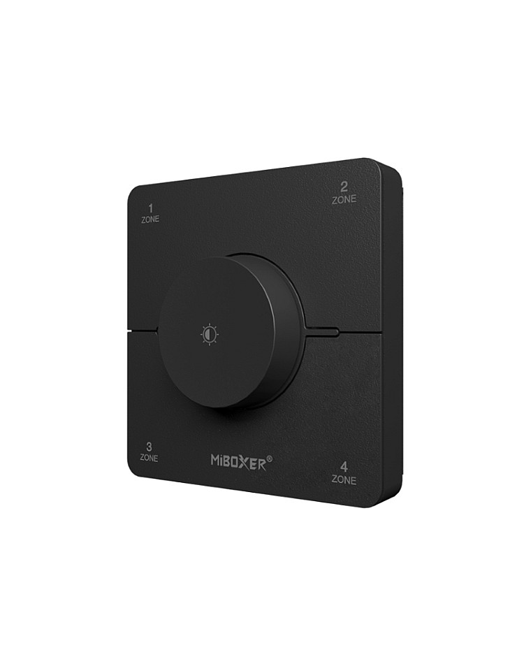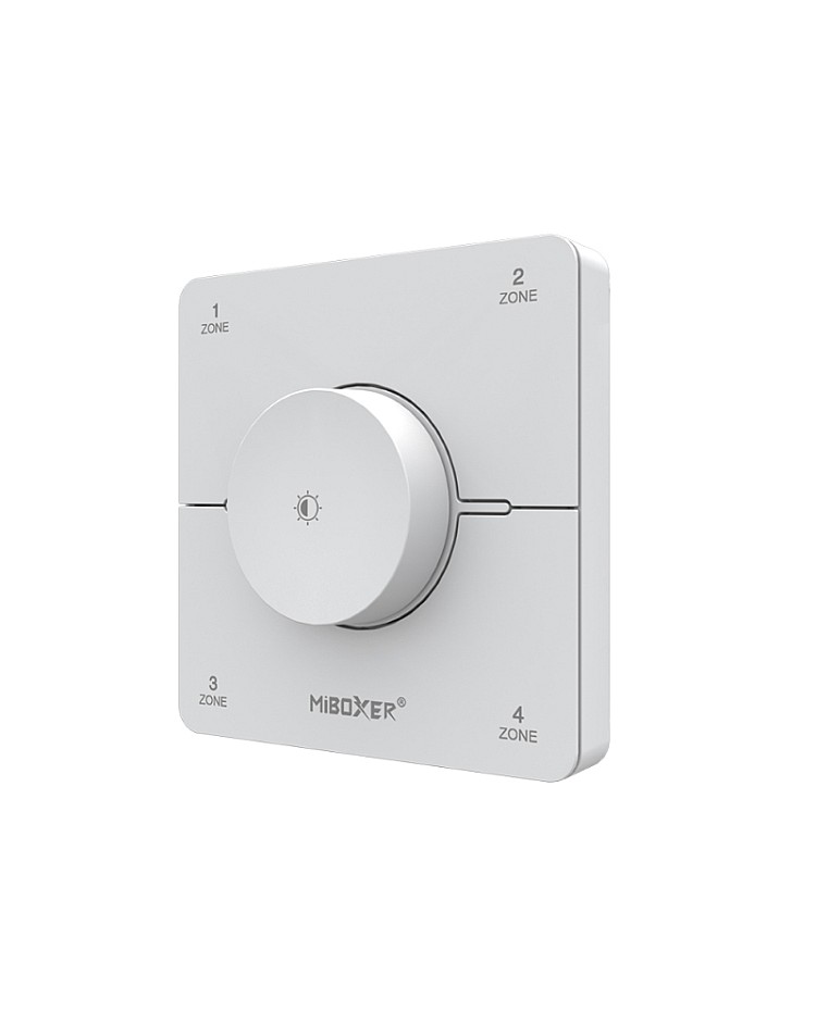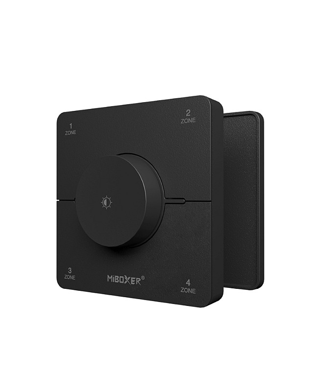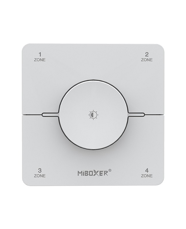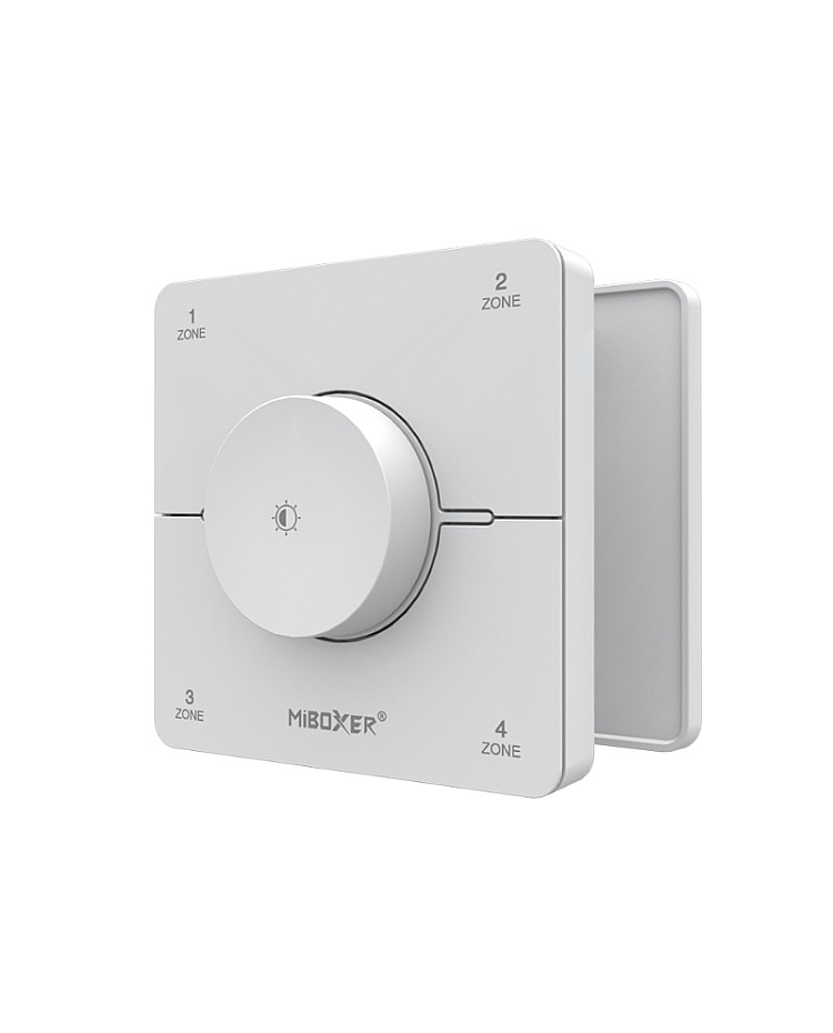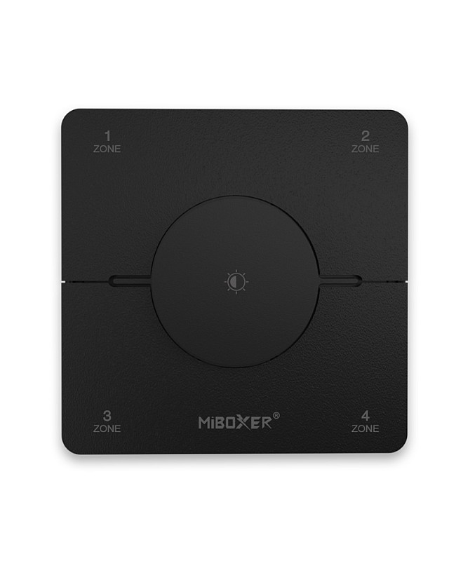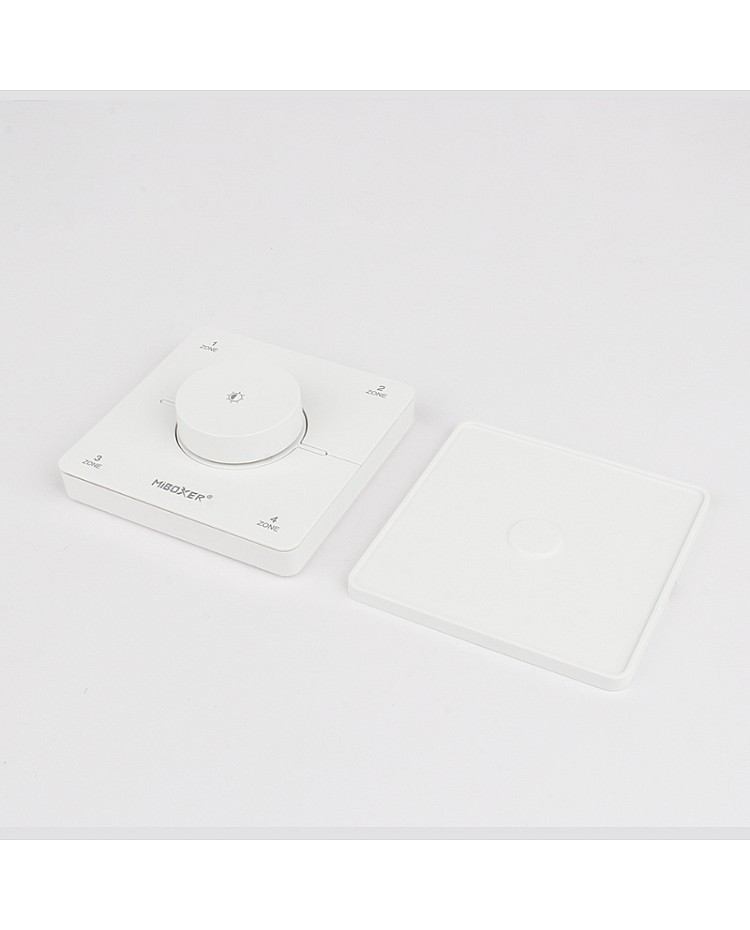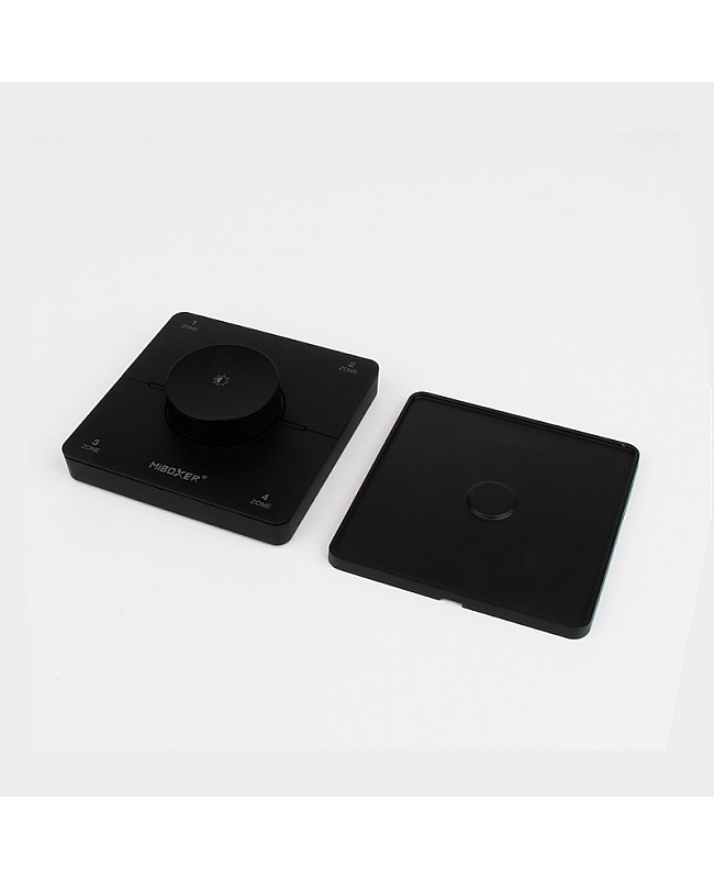 The MiBoxer K0S LED light rotating panel remotes utilize 2.4G wireless transmission technology and can be paired with MiBoxer and Mi-light 2.4G series single-color and dual white LED Lights to adjust brightness and color temperature for various scenes. Rotating the switch in the center allows for easy adjustment of the CCT and brightness, creating a comfortable lighting environment. The K0S features a 4-zone design, allowing for easy saving of lights into individual zones, with a single key to turn on or off lights in each zone. It supports matching multiple devices and can control multiple devices simultaneously. Short-press the rotary switch in the center to switch the output mode from CCT to single color; the default working mode is CCT. The K0S has an 86-type design and a magnetic holder for easy installation and use.