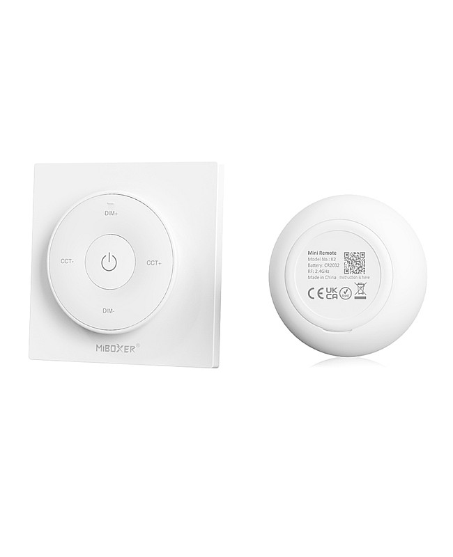 The MiBoxer K2 2.4G RF remote control is compatible with MiBoxer or Mi-Light 2.4G series LED lights and can work with single-color or CCT LED lights to adjust the brightness and color temperature. The MiBoxer remote comes with an 86-type magnetic holder, which makes it easy to take off and put the light remote control back on the holder, so you do not worry about losing it. There are two colors of remote products available: black and white. A single CR2032 battery powers it, has low power consumption, and is energy efficient. The control distance is up to 30 meters, allowing you to easily control the MiBoxer lighting for various scenes.