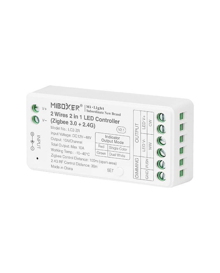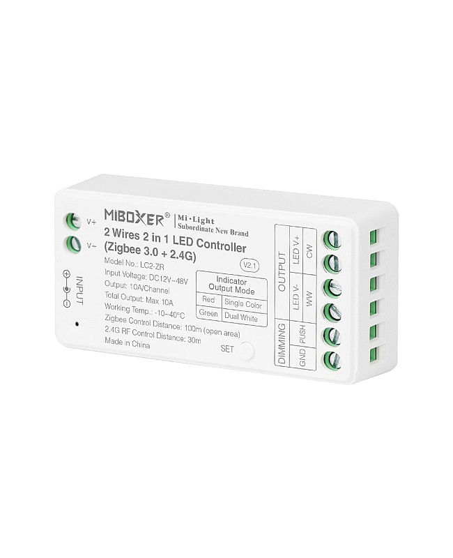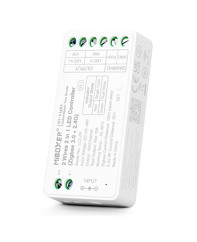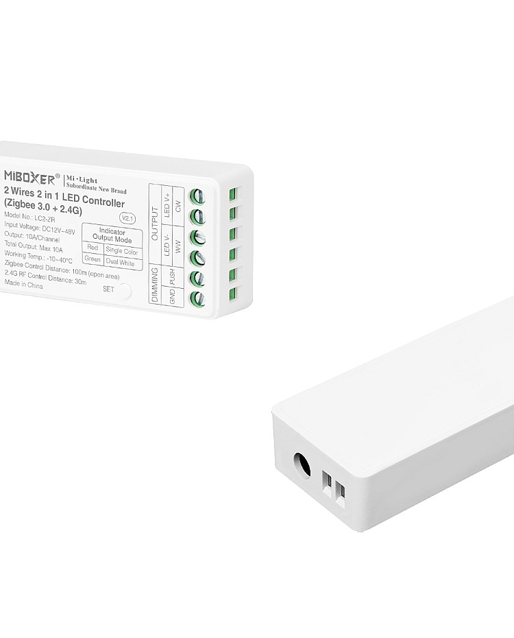The MiBoxer LC2-ZR wireless DC dimmer integrates Zigbee 3.0 and 2.4G communication technology modules, and can be controlled by Zigbee 3.0 and 2.4G remote controls to adjust the color temperature and brightness. The color temperature can be adjusted from 2700K to 6500K, and the brightness can be stepped from 1% to 100%. There is a button " SET " on the dimmer, and you can press it continuously to switch the output mode from single color to dual white. After being connected to a Zigbee 3.0 gateway, the MiBoxer DC light dimmer can be controlled by a smartphone APP and third-party voice control. You can use the APP or voice commands to change the LED light for various scenes. On the APP, you also can achieve other functions like timing, music rhythm, scene customization, etc. the MiLight dimmer can enter other standard Zigbee 3.0 gateways like Philips Hue, IKEA TRADFRI, Amazon Echo series, etc., can transmit the signals from the 2.4G remote control to another same model within 30 meters, all of them will work synchronously.