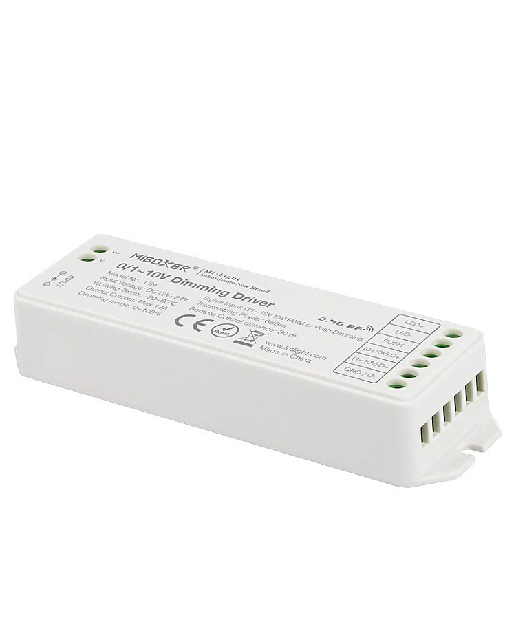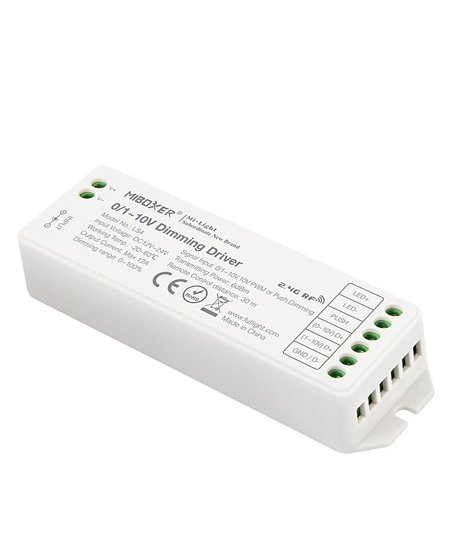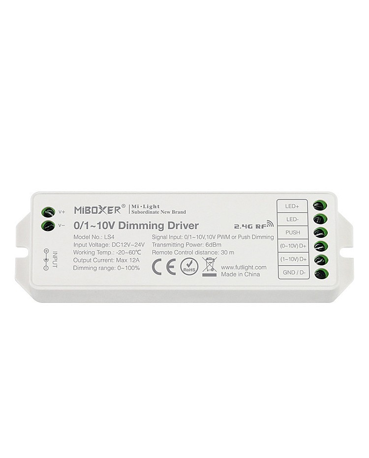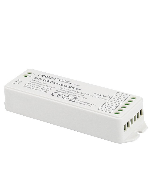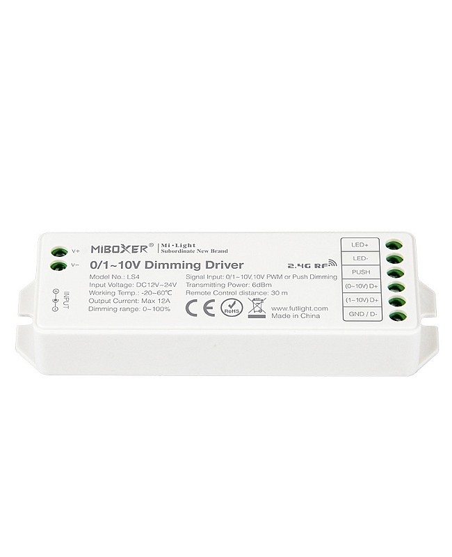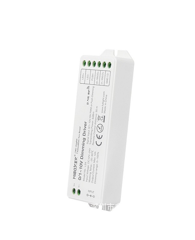 The MiBoxer LS4 0-10V dimmable LED driver supports 0-10V, 1-10V, 10V PWM dimming panels or push button dimming, can be controlled by 2.4G RF remote controls, adjust the lighting brightness conveniently, soft and no flicker, compatible with FUT006, FUT007, FUT087, B1, K1, S1, etc. After adding the 2.4G gateway WL-BOX1, smartphone APP, and third-party voice commands can control the 0- 10V LED driver, supporting Amazon Alexa and Google Assistant. If the dimming driver gets the signals from the Remotes and transmits them to other same dimming drivers within 30 meters, the brightness of all LED lights will change synchronously.