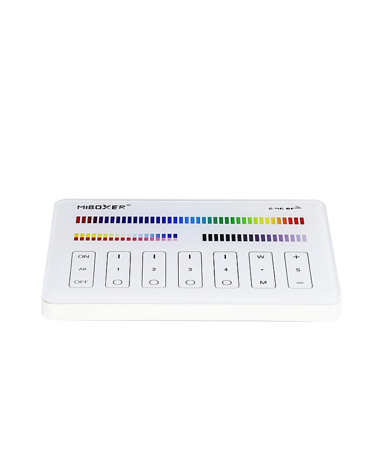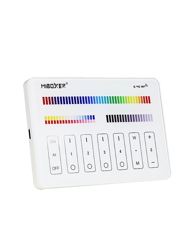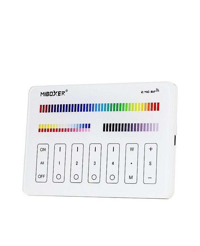 The MiBoxer M4 RGBWW wireless lighting control is a sensitive, touch-sensitive panel design with a high-precision capacitive touch screen IC. The touch screen is very stable. When the buttons are touched, the LED indicator light will flash with different sounds. The remotes for LED lights have a 4-zone individually controlled design. Each zone controls countless lamps or controllers and adopts 2.4G wireless transmitting technology, a control distance of up to 30 meters. The RGBWW wireless lighting control supports RGB, RGBW, and RGBWW series Controllers. There are 16 million colors and 9 dynamic modes available. You can adjust the color temperature from 2700K to 6500K and brightness from 1% to 100%.