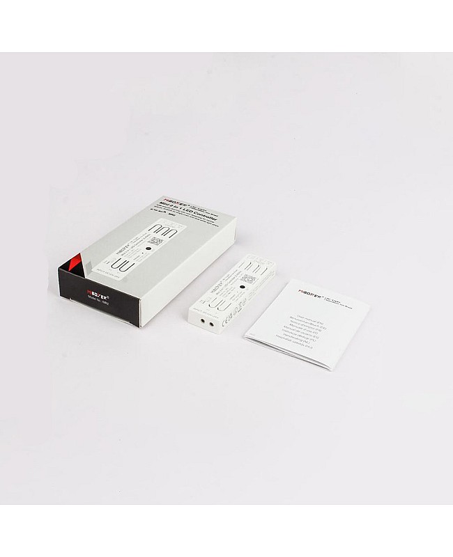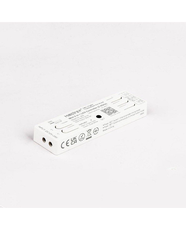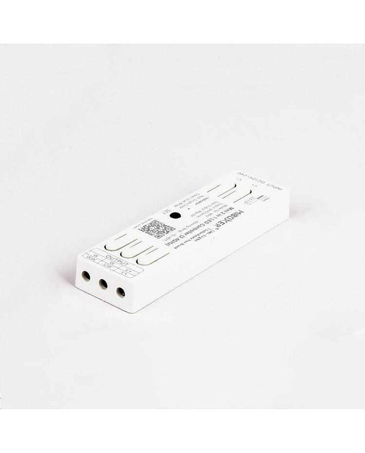 The MiBoxer MR2 low-voltage dimmer features a 2-in-1 design compatible with both single-color and dual-white LED lights. There is a physical button on the controller that you can press to switch the output mode; the indicator light will change color to indicate the selected output mode. Its mini-size and compact structure allow it to be placed in a small or tight location for indoor projects. It utilizes 2.4G wireless transmission and remote control technology, featuring fast transmission, a stable signal, and anti-interference capabilities. A 2.4G remote control allows for adjusting brightness and color temperature for various scenes. 4096 levels of smooth dimming are available, with a minimum brightness of 0.1%. After pairing with a 2.4G gateway, it can be controlled by smartphone apps or third-party voice commands. The 12V low-voltage light dimmer forwards the remote control signal to another controller within 30 meters, making the remote control distance virtually limitless, and all controllers will work in sync.