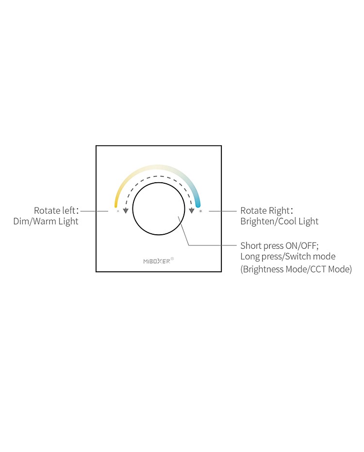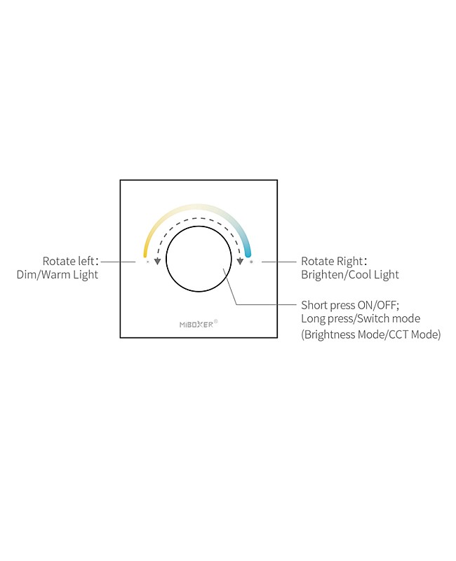 The MiBoxer P0 CCT Panel Controllers are designed for single-color and Tunable White LED Strip Lights, which allow you to adjust the brightness or color temperature for various scenes. The panel controller features a rotating switch, allowing you to adjust the brightness or color temperature steplessly by rotating it. With 4096 levels of smooth dim, the minimum brightness can reach 0.1%. It utilizes 2.4G wireless and remote control technology, ensuring efficient transmission, strong stability, and resistance to interference. They can be widely used in intelligent lighting control for commercial, hotel, and home lighting. The P0 Controller can pair with up to 12 remote controllers and has a control distance of up to 30 meters. The CCT Panel will auto-forward the signal directly to other ones, which makes the remote control distance infinite.