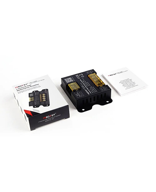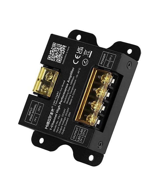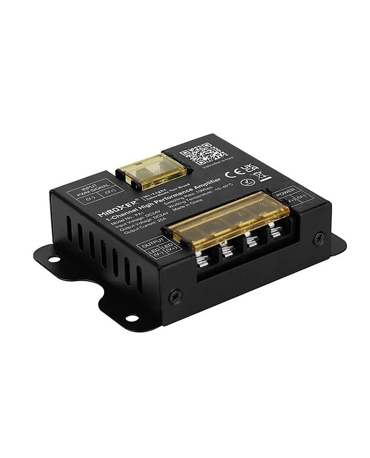 The MiBoxer PA1 high-performance Amplifier has a one-channel output design, an excellent choice for powering single-color LED strips. Compatible with MiBoxer and Milight series controllers and all PMW-type light controllers in the market. It adopts a high current MOSFET output to ensure high output power. It has a high-speed optical coupler and a 10 Mbps output rate. The MiBoxer amplifier works on DC24V, and the maximum output current is 25A. Its metal shell design is conducive to heat dissipation and safer to use.