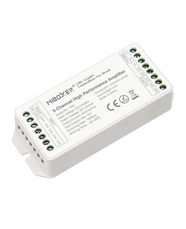 The MiBoxer PA5 LED RGB amplifier has a five-channel design. You can use them for RGB, RGBW, RGBWW, and RGB+CCT LED strips. The PA5 adopts a high-speed optical coupler with a 10 Mbps output rate, which can output the signal of the main controller altogether and synchronously. The input and output are with optoelectronic isolation. Theoretically, you can add unlimited MiBoxer amplifiers to your lighting project and let all LED strips simultaneously change the lighting effect. The MiBoxer amplifier works on all PWM series LED controllers, which are made with a big current MOSFET to ensure a high rate of output. You can connect twice as many LEDs every time you add one more amplifier.