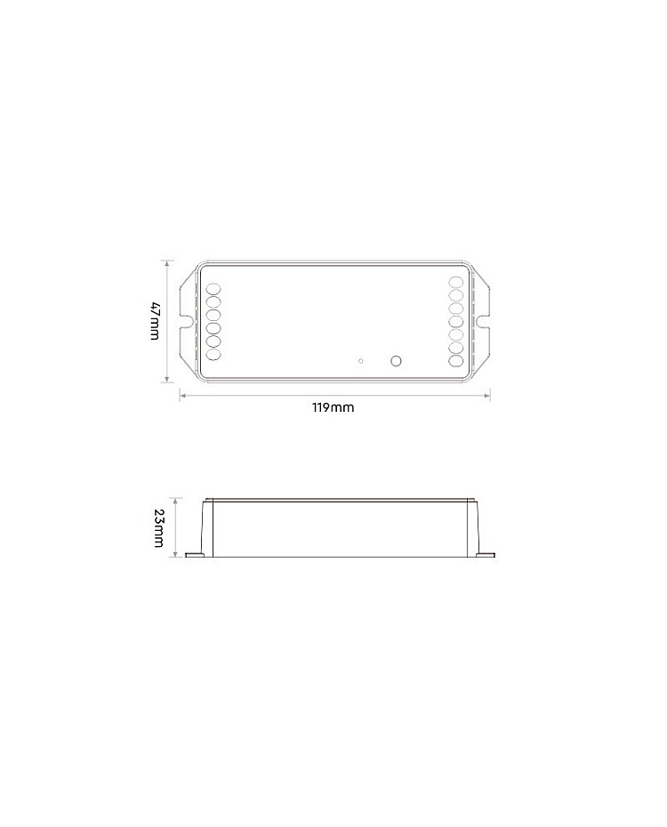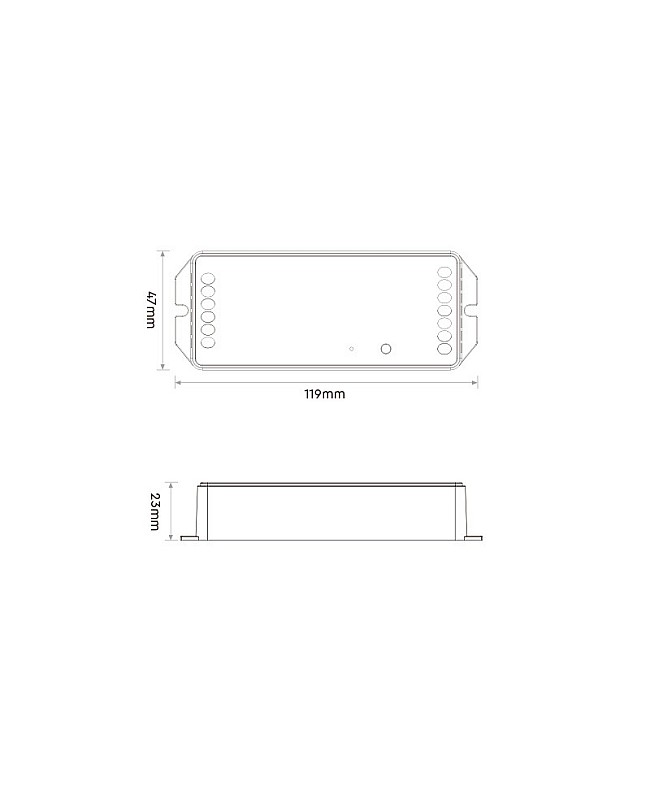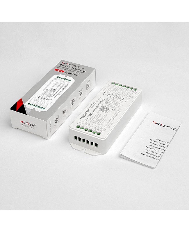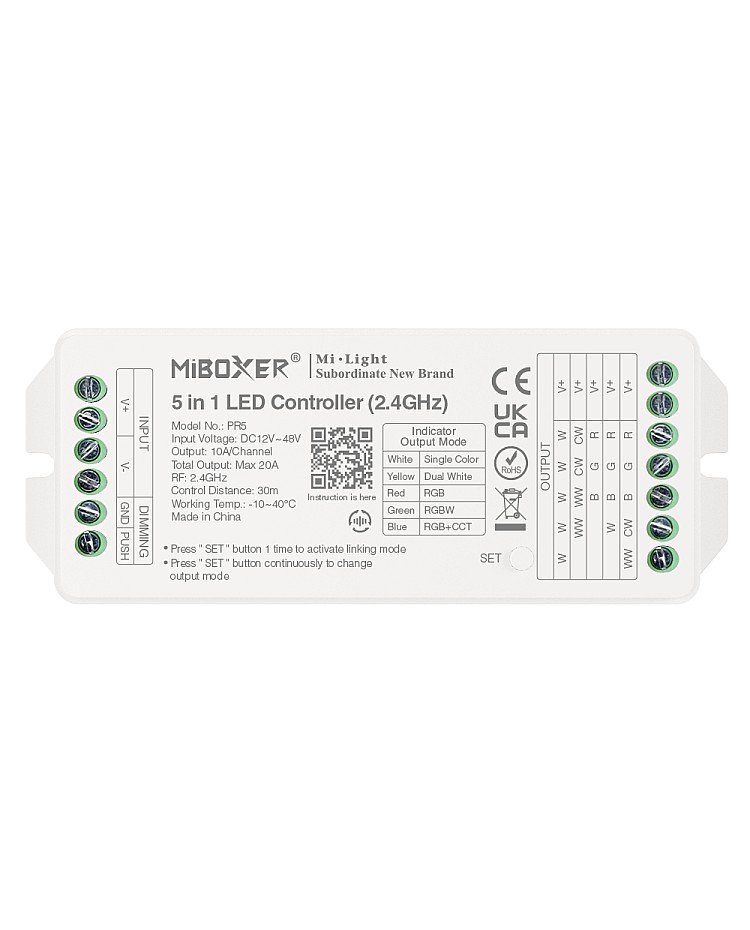The MiBoxer PR5 LED Lighting Controllers feature a 5-in-1 design, compatible with single-color, dual-white, RGB, RGBW, and RGB+CCT LED Lights. They adopt widely used 2.4GHz wireless technology and can be controlled by MiBoxers and Mi-Light 2.4G Remote Controls. The lightweight design and compact size enable quick and convenient installation. There is a physical button labeled "SET" on the controller, which you can press continuously to switch the output mode between single color, dual white, RGB, RGBW, and RGB+CCT. Built-in 18 dynamic modes, including jump and gradient. 16 million colors, saturation, brightness, and color temperature are adjustable for various scenes. One lighting controller can be paired with up to 12 remotes and has a control distance of up to 30 meters. The PR5 will forward the remote control signal to another device, effectively increasing the control distance to infinity, and the controllers will operate under the same color or dynamic pattern. After pairing with 2.4G Bridges, the MiBoxer Lighting Controller supports Tuya Smart APP control and can be controlled by voice commands from Amazon Alexa or Google Assistant. They are suitable for residential and commercial modern LED lighting control applications.